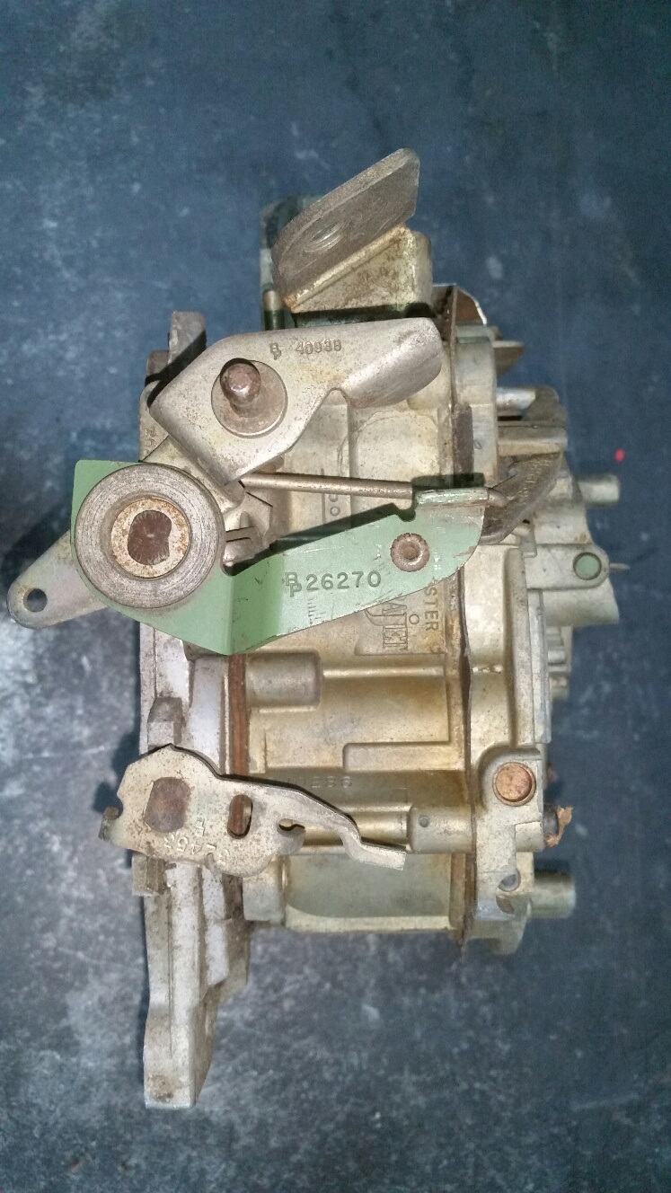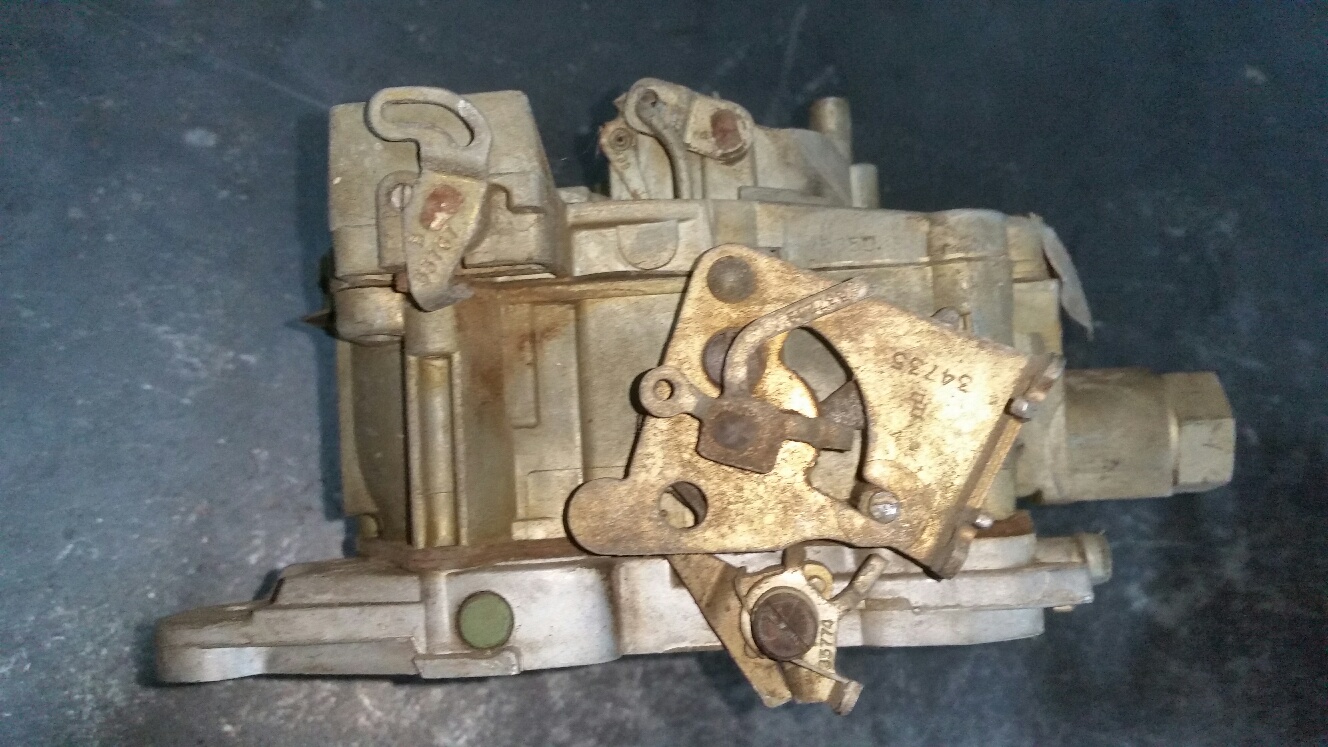 SOLD...This is a pretty nice carb and still has the tag on it. It's dirty, but has pretty good color to it. I can see that there are 2 pieces missing, the rod that connects the primary and secondary shaft and the vacuum pot that goes to the secondary door. There may be more missing that I don't know about. Everything moves free and smooth and seems to be in real good condition. I have not removed the top to look inside. I don't know of the fuel inlet is original or not. $500 plus shipping. 7040286 D00F E