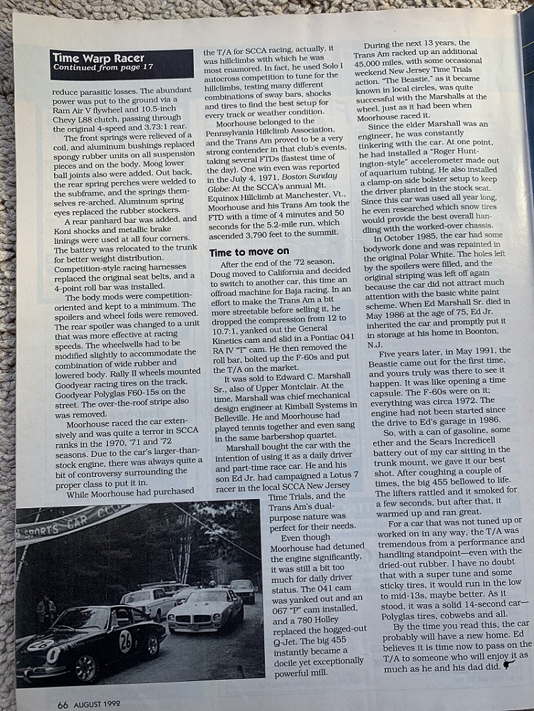 https://forums.maxperformanceinc.com/forums I remember the 1992 article. Thats about it. 70 TA is my favorite car and its cool that this one was campaigned. There are some SCCA type folks on the PY Forum 70-73 TA/Bird section is the best bet for starters. Good Luck to you Pontiac gave one of the SCCA Officials a new 1972 TA - special painted Red. It was never raced, and rarely even driven. Still exists in excellent condition |