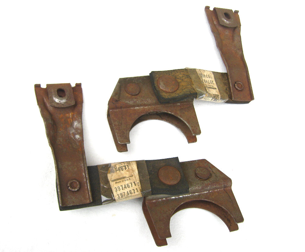 Made by GM about 50 years ago. The rivets on these are stamped "R" and "L". They bolt on top of the rear frame. Both have surface rust, otherwise never installed.