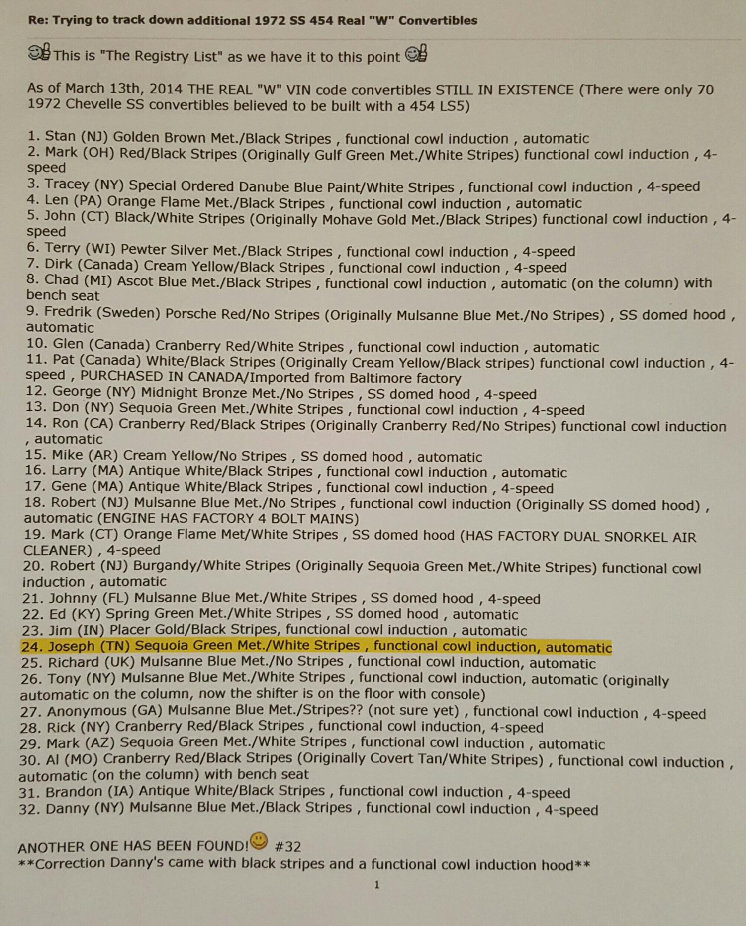 VIN: 1D67W2K14769 (48) Sequoia Green (743) White Bucket (A) White top (W) White Stripe OPTIONS: LS5 454, M40 Automatic Turbo Transmission, 3:31 (RUC) 12 Bolt (non posi), Cowl Induction, PS, PB, Bucket Seats, Center Console, Tilt Column, Sport Wheel, Tach/Gauge/Clock Combo, AM/FM Stereo Radio FEATURES: Frame off ground up restoration completed in 2012. Less than 150 miles since restoration. Stored in climate control environment. Paint and Body by Dave Birdwell of Dave's Restorations. It does not retain it's original engine or trans. When I purchased the car it was in need of complete repair but was all there minus the engine and trans. It does have all of the hard to find one year only 1972 Chevelle LS5 under hood parts. The 1972 Chevelle SS454 Convertible's are rare (estimated less than 100 made). This is one of 32 that have been located through an extensive search over several years. It is car #24 in the Official W-Code Convertible Registry. It is also featured as an example in Dale's LS5 Registry for a 72 LS5 Convertible. I tried to restore this car back to 100% stock using as many original parts as possible. Dash was restored by Jim Brady of Super Sport Sales & Service. Gauge cluster was restored by John at Red Line Gauge & Clock Repair. Moldings were restored by Dennis Barnett of Classic Moldings Restoration. Assembly line labels were done specific to the car by Rich Recupero of Chevelle Restoration Labels. Radio restored by Howard Foulds of HF Enterprises. I have owned this car since 2009. I put my heart and soul into bringing it back to life and now it is time for someone else to enjoy it. I am open to reasonable offers. If you have any questions or would like to see other pics please let me know. I can be reached at 901-870-6646 or PM me. If I do not answer leave a message and I will respond back as soon as possible. Car is Located in Brownsville Tennessee. One hour East of Memphis off I-40.