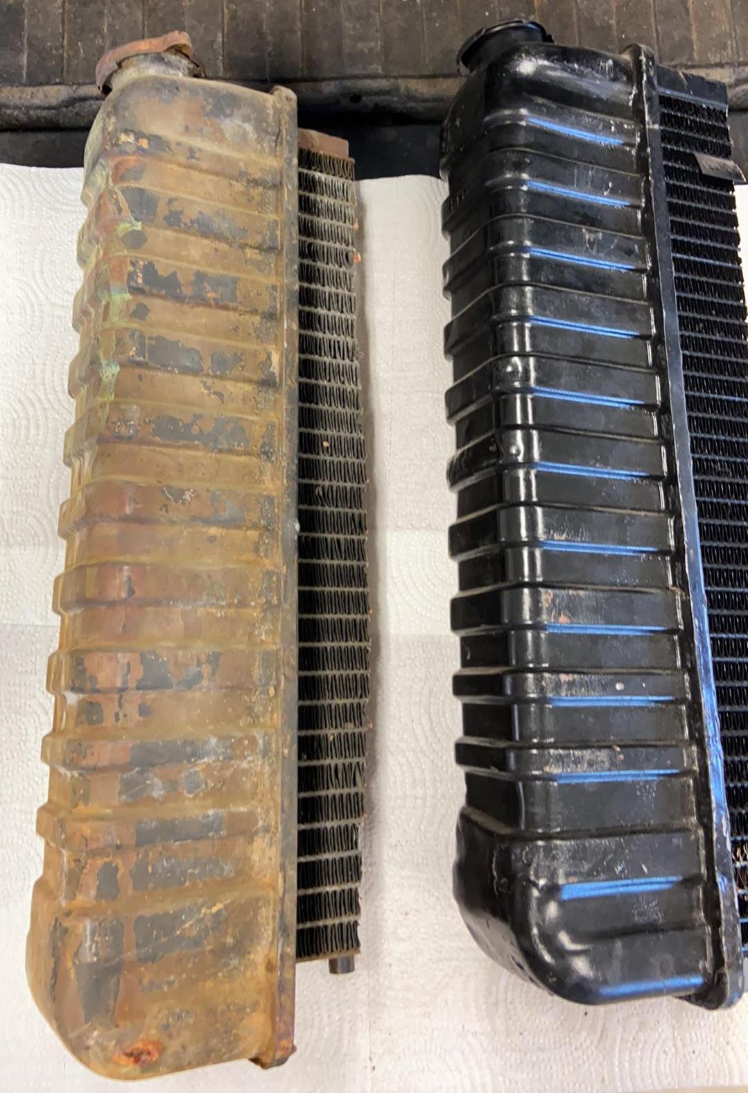 -XJ Tank dated "E" (May 1970) $350 repair weld over the "Harrison" stamp. Tanks may have tiny bumps or bruises that can easily be straightened out before you rebuilt the rad. Sorry RC-15 Cap is NOT included showing on one XJ tank. I will also throw in an original ribbed over flow hose. Will sell IA tank on it's own for $200 *SOLD* Shipping Add $40, Paypal "Friends" Note IA covers all 2 to 3 row radiators while IF covers V01 Heavy Duty option, 4.10 geared LS6 454 or A/C 4 row radiators. XJ side is universal to all 4 speed applications for Big Block.