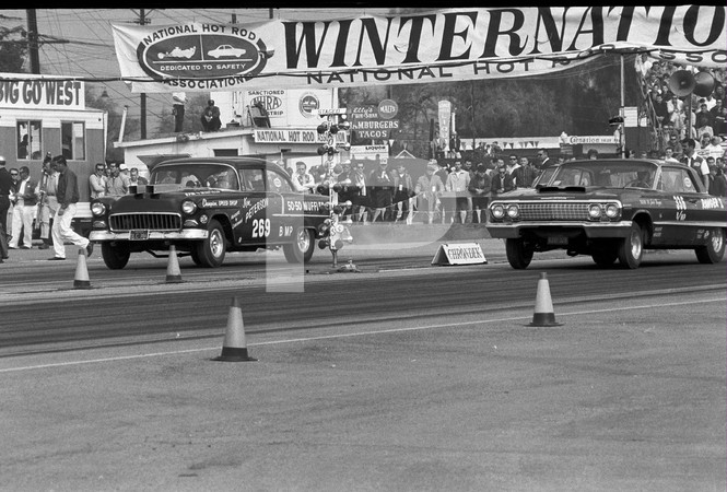 So here are several new photos that have showed up. Presumably the second owner which makes this 1965- (?). Winternationals at Pomona. Car is relettered with “Ranger ll”. “Dyno Tuned by Jack Bayer” has changed to “Engine by Jack Bayer”. No new drivers name on roof. Note the Ramcharger scoop now on the hood. Car has changed classes and running B/MP. Does anyone recognize the car in this configuration and may know who the owner was? All I know is he is referred to as “Barstow rich kid” on another forum. If the starting line pic is during eliminations then there surely is a record of who the owner was. Where would I look for all the class competitors and not just the winners? |