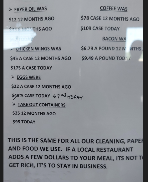 It seems that even local diners are raising their prices thru the roof...I assume this is mainly due to things costing more. Thursday I had lunch with a friend and a turkey club and a Reuben were $30...add in 2 iced teas and the tip and it was over $40 for lunch.