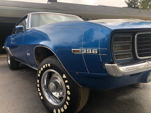 1969 Camaro RS/SS 396-375hp 4 speed, paint code 71 lemans blue, B black vinyl top (removed), build date 02D, X22 style trim w/396, 712 interior black comfortweave (new seat covers installed). Engine is stamped T0204JH, heads 840 dated L-28-8 and I-30-8, axle code is BS 11-22- G 1. engine is not original and not in car. Options are factory installed cowl hood, console tach and gauges, spoilers,rear bumper guards. Also has 4 correct YJ wheels.