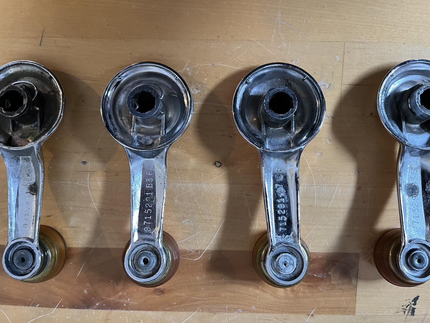 Set of used (4) 1970 Chevelle window crank handles.   Used so best for original or survivor car.  May fit other GM years and vehicles as well.  Plastic knobs are in good condition but yellow with age as seen in pics.  I've had these for years. Part numbers are: 9715291-08 9715291 B3F 9715291 B3F 9715291 A7F $75 shipped USPS priority mail