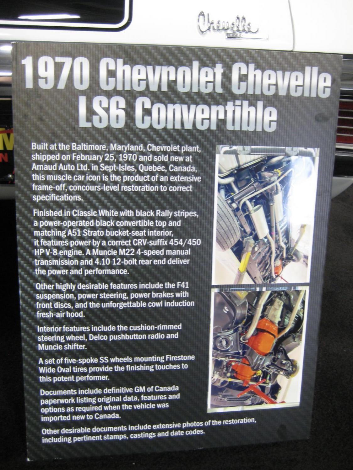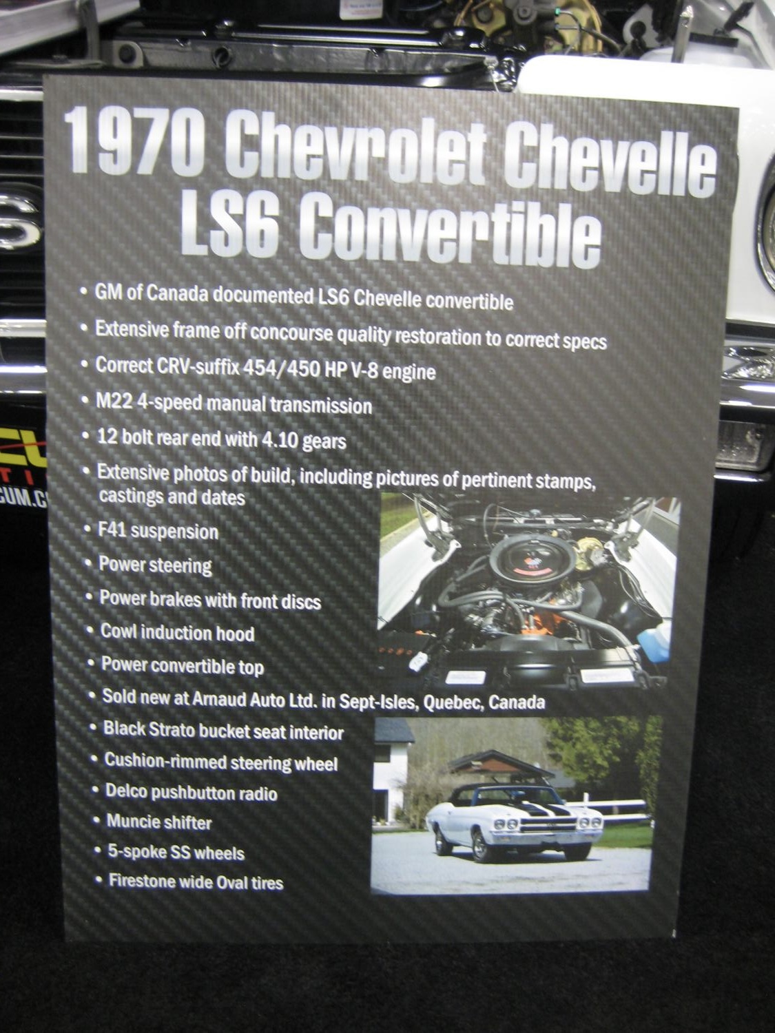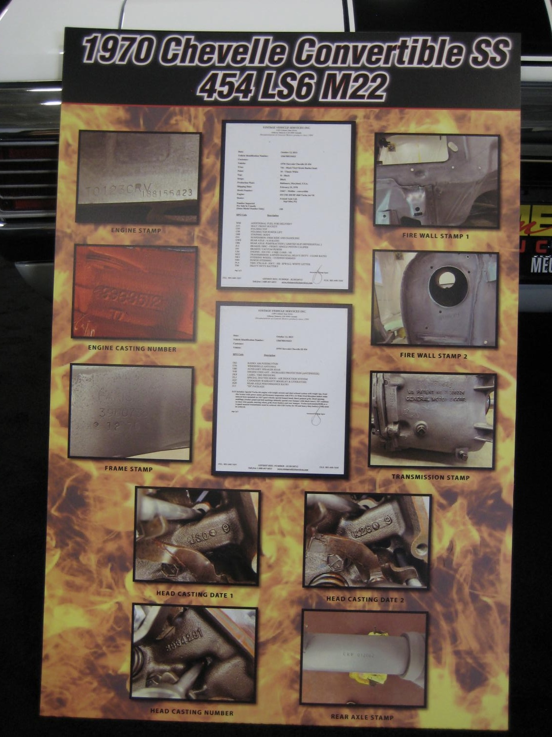 There was an extensive photo album with this car. Here are pictures of the engine and transmission stamps along with the trim tag and the signs that were by the car. The signs just say the car has a correct drivetrain, but the photos show the VIN stamps on the engine and transmission. I talked to the owner and we said the car has its original drivetrain. He said it was kind of rough when he found it and was painted Cranberry Red with black stripes. They didn't find any build sheets when the car was restored, but he had the GM of Canada paperwork. The restoration was just recently completed and he never even drove the car. I don't believe he had it inspected or certified by anyone. I was surprised it went for as much as it did. Was this a known car?