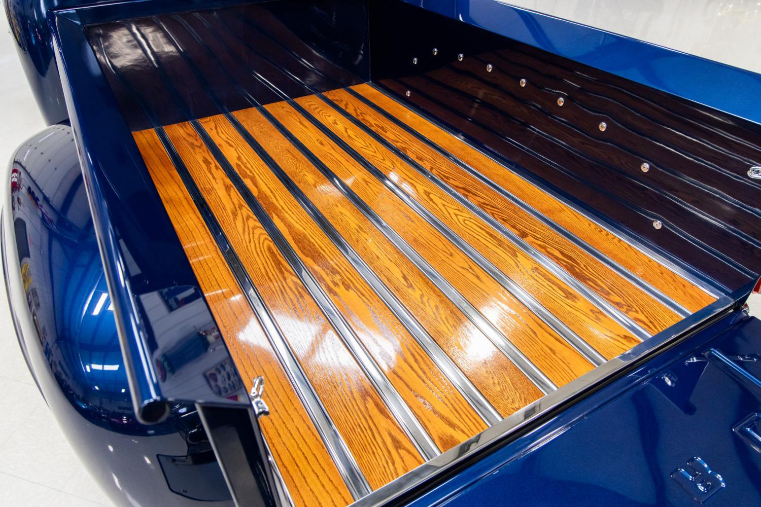 Known as “Blue Shadow”, this 1956 Ford F-100 custom pickup is equipped with a Ford Lighting 5.8L V8 with Inglese 8-stack fuel injection, Ford Performance T-5 manual transmission and modified chassis. As the original VIN number indicates, this example was built at the Chicago, IL factory as an F-100 model with a 238 V8. It was built by Bob Pierce of BP Customs and Rods located in Connecticut. It earned the “Builders Choice Award” and “Designers Pick” at the Goodguys East Coast Nationals. The two awards are included with the sale. Since completion it's only been driven 115 miles as it was trailered to most shows and events. Everything on the truck was restored or replaced to high show-quality standards. The body is extremely straight with excellent panel fitment. The customized tilt forward hood and doors open very nicely. It was refinished in Volkswagen Shadow Blue with DuPont ChromaBase products. The paint has been detailed to a brilliant shine and ceramic coated with Gtechniq Serum Ultra. The front windshield, side vents, side windows and rear window was replaced with new Hehr tinted glass. It's equipped with modern headlights, LED tail lights and LED third brake light fabricated into the rear cab. It's been outfitted with Billet Specialties Heritage 20” polished wheels and Falken tires. The smooth bed inner panels were painted and enhanced with stainless hardware, Oak floors and stainless slats. The Ford embossed tail gate is supported with chrome hinges and latches. The interior dash was slightly modified by incorporating Vintage Air Conditioning controls and side vents. The cabin was painted body color to match the exterior. The headliner and sun visors were upholstered in tan cloth. The custom kick panels, door panels and bench seat were upholstered in soft brown leather. The floors are covered with custom brown carpeting and molded floor mats. Some of the interior custom features include LED lighting, rear view mirror, Classic Instruments Retro black gauges, Flaming River tilt steering column with billet levers, Flaming River Banjo steering wheel, Specialty power windows, power door locks, power seat, billet door handles, chrome shifter with matching leather boot, seat belts and Custom Autosound Secertaudio SST with remote control that flips down from under the dash. The painted engine compartment is highly detailed throughout. The smoothed firewall showcases a Ford embossed logo and the inner fenders are covered with aluminum panels. The truck is powered by a rebuilt Ford Lighting 5.8L 351 W V8 that runs excellent. The engine was upgraded with a roller cam and Ford Racing GT40 aluminum heads. The engine is equipped with an Inglese Intake and 8-stack fuel injection system with Fast Fuel management. The engine is dressed with high-quality Profile aluminum valve covers and Billet Specialties Tru-Trac pulley system. Some other upgrades include a Ford Racing starter, MSD ignition system, Billet Specialties alternator and power steering reservoir. The engine is cooled by a Griffith aluminum radiator with a SPAL electric fan. The engine breathes through ceramic coated headers and a ceramic coated dual exhaust system with polished Borla mufflers. The engine is coupled to a Ford Performance Super Duty T-5 manual transmission with hydraulic clutch. The power is transferred to the Ford Mustang GT POSI rear end with 3.27 gears. The undercarriage is highly detailed throughout. The original chassis was modified for additional strength and to accommodate the upgraded parts. It's equipped with a Heidts Mustang IFS front end with power rack and pinion steering and a 4-link rear end with QA1 coil overs. The Wilwood braking system consists of 6-pistion red calipers with 14” drilled rotors on the front and red calipers with 12.88 drilled rotors on the rear. This truck has been completely serviced and detailed which is documented with an invoice that's included. From the MS CLASSIC CARS Collection.