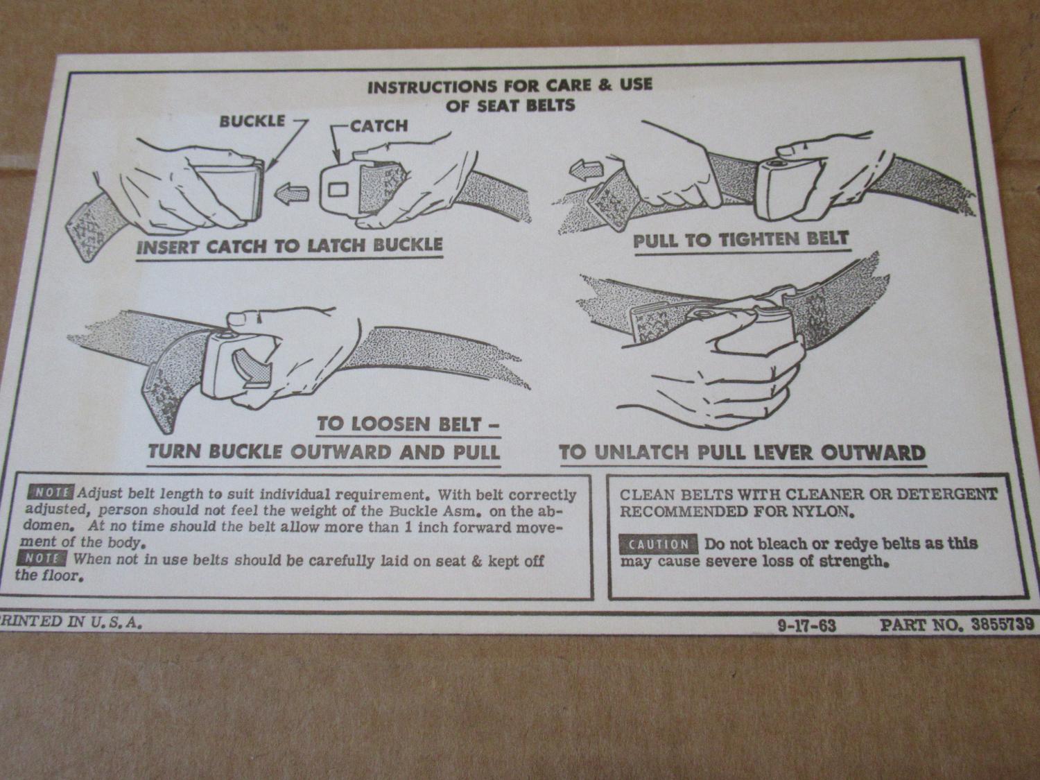 Original Seat Belt Instruction Card - Not a repro. 1964 - 1967 Corvette. 1967 Camaro & Firebird Plus other Chevrolet 1964 - 1967 Part # 3855739 Dated 9 - 17- 63. Printed in U.S.A. $40 plus shipping from 14428