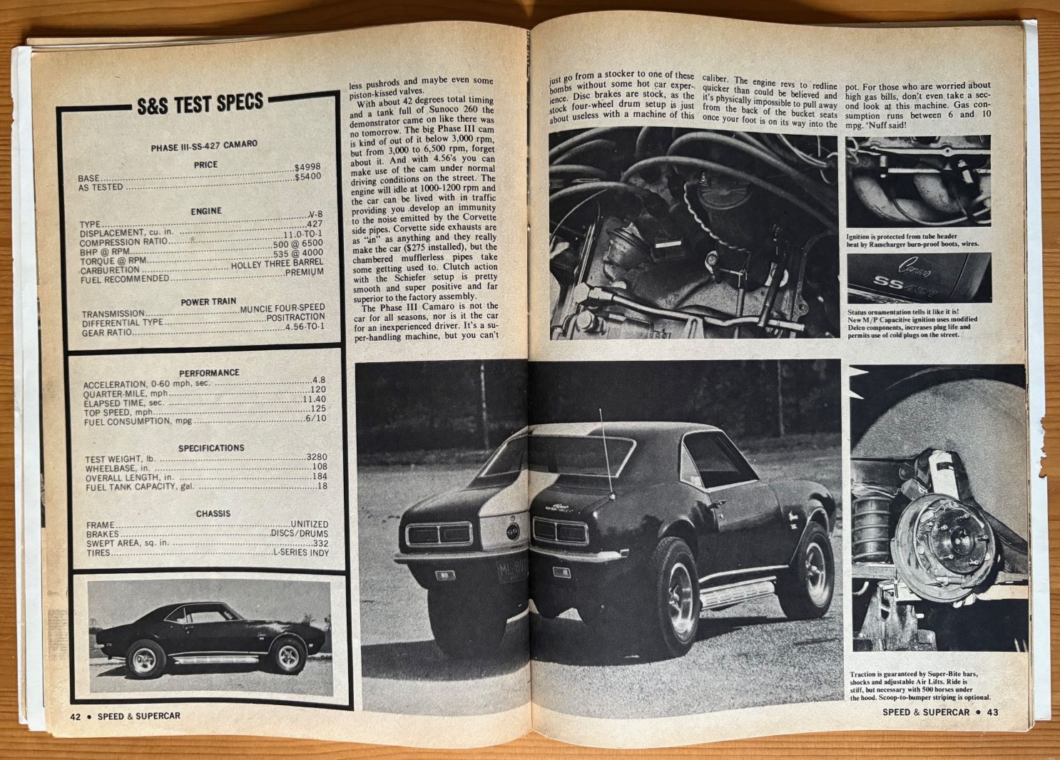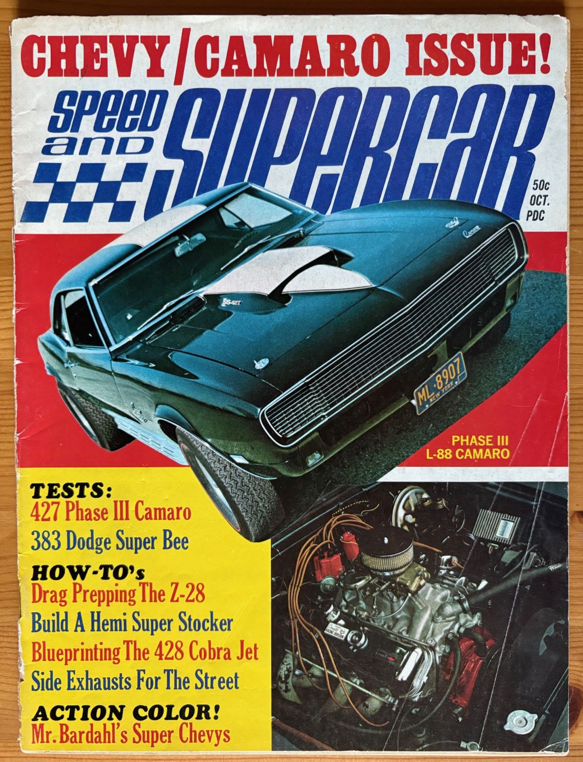 The Speed & Supercar Oct 1968 magazine is quite focused with several articles about Camaro and other Chevy’s: Testing a Baldwin-Motion Phase III SS-427 Camaro, Build a C/Stock Z28 Camaro, Ram induction mods for Camaro, Side pipes for Camaro and Corvette as well as centerfold color pictures of Mr Bardahls’s Chevy stockers. The magazine cover shows some patina and wear, inside is nice, some yellowing of the pages can be observed. $15.