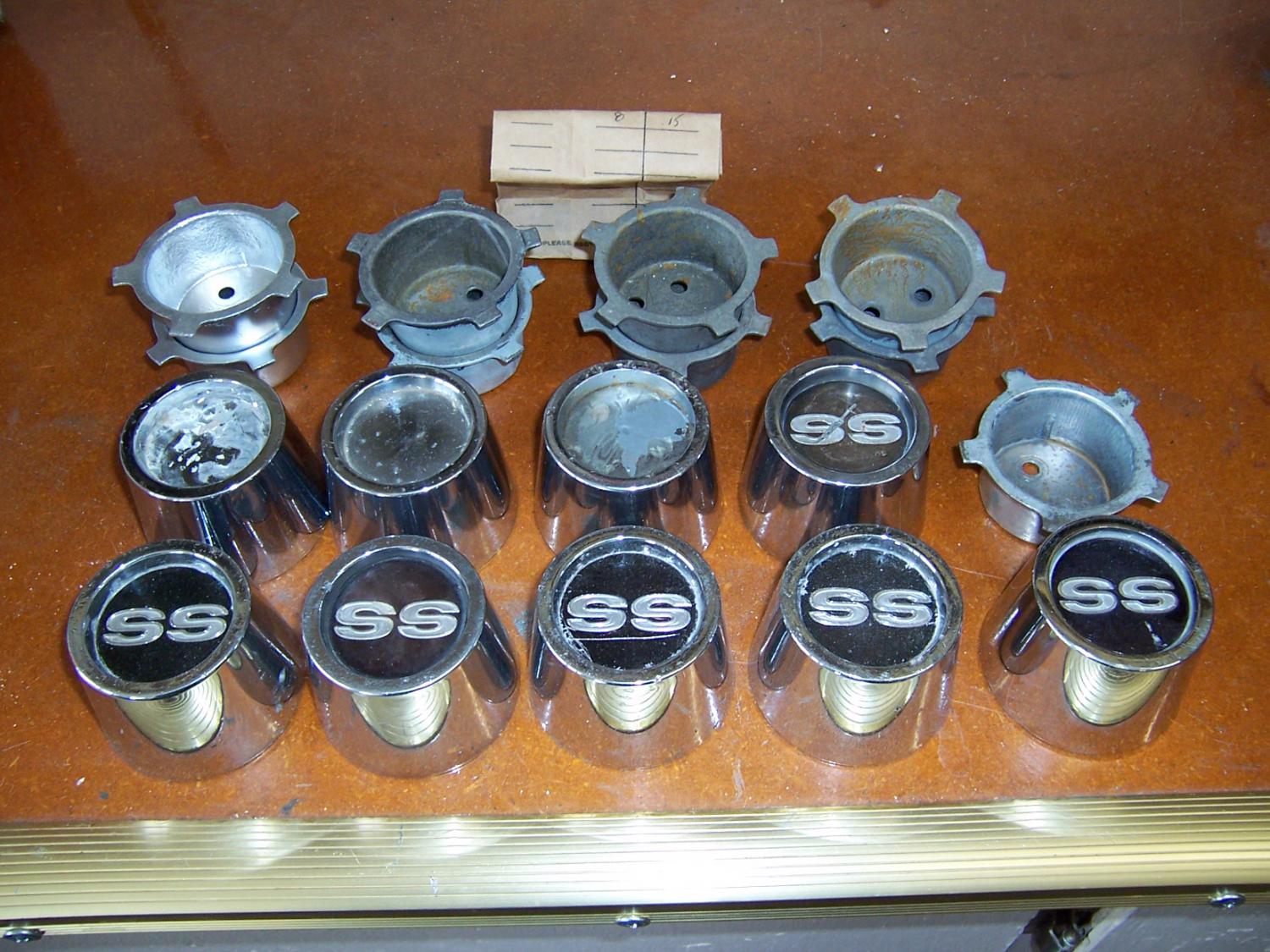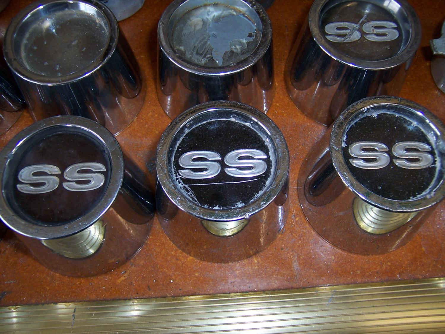 I have here a total of nine center caps for 1969 and 1970 'SS' wheels. To the best of my knowledge, these are all original GM parts, having the part number 3956770 cast into the back side of the cap. One piece is the shallow recessed center, and the other eight are all the deeper recess. As you can see in the pictures, these are not show-worthy pieces, but at least four of them are presentable for a 'driver' type car. There are some nicks, pits, and scratches in the chrome, and three have the foil 'SS' emblem insert missing. All nine have the retainers and mounting screws. I just hate to throw them away if someone out there could use them, so I'm going to start out asking $20 (plus shipping) for the whole lot....if there are no takers after a couple weeks, the $20 becomes $0.