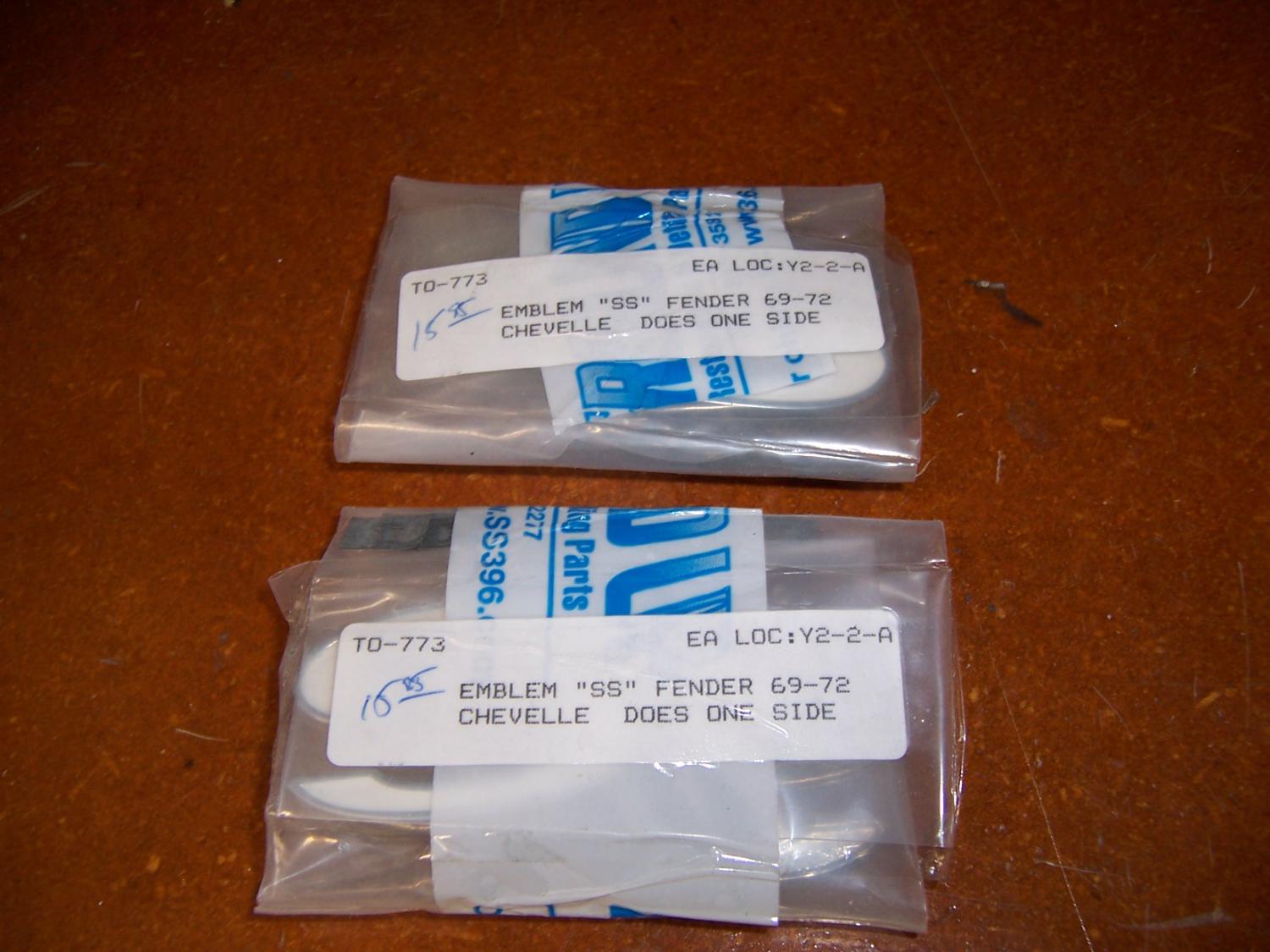 Two pair of repro 'SS' emblems for front fenders of 1969 -1972 Chevelle. One pair does one front fender. Never opened from when I bought them from Ground Up years ago. Currently listed at Ground Up for $19.99 per pair; I'll take $25 (plus shipping) for both pairs.