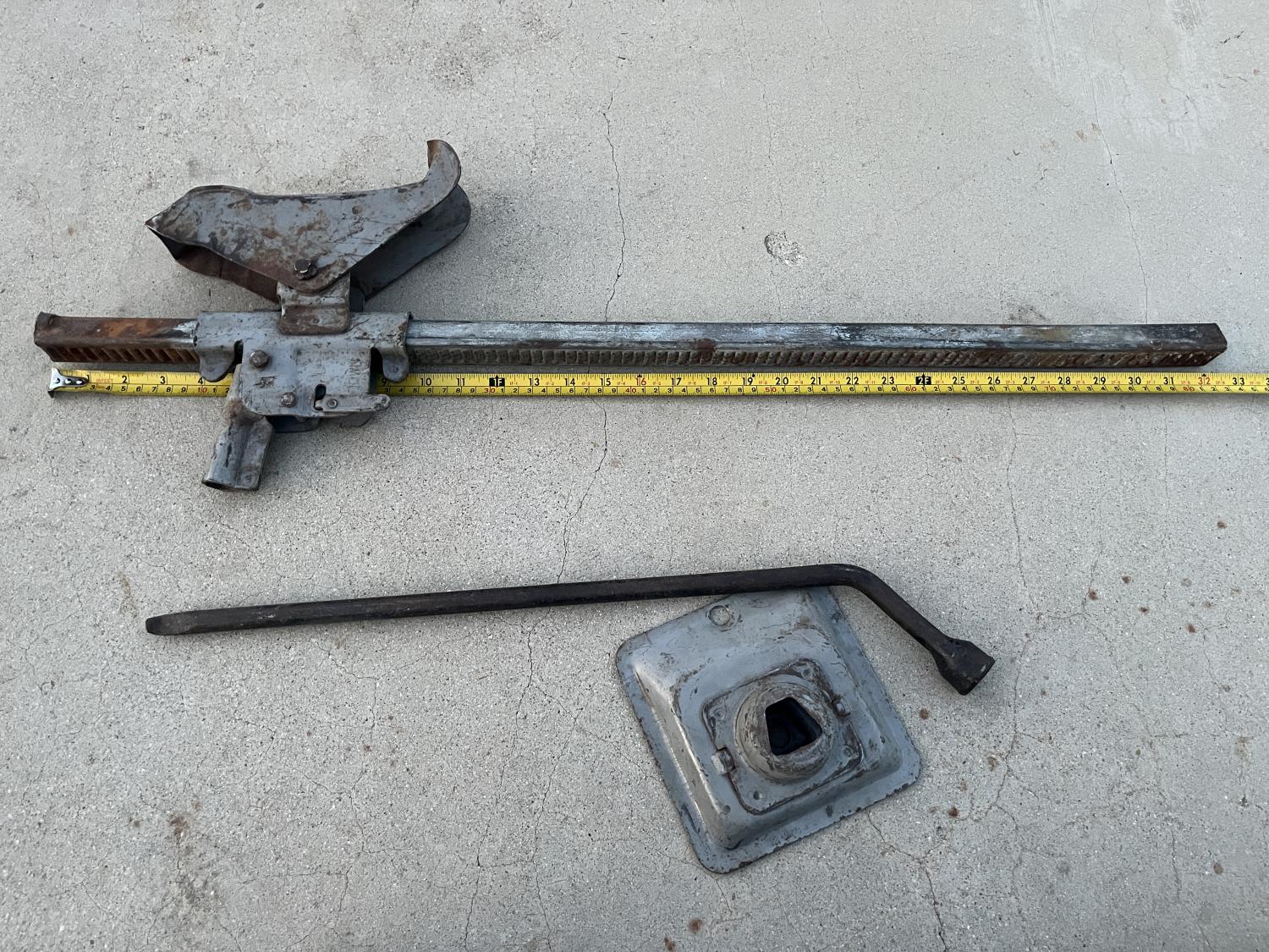 A nice and patina'd jack set up out of a 1967 Chevelle. Includes the base and "0" stamped (cast) lug wrench... The shaft is 32 3/8" or 1/4" stamped RH, Inc. A perfect detail item for your trunk when you're pulling out you cooler, or lawn chair or spare tire... It's the details, as we all know! Easy restoration looks like, or leave it as-is. Hard to find these matched sets anymore IMHO. Cheers Friends, Anthony |