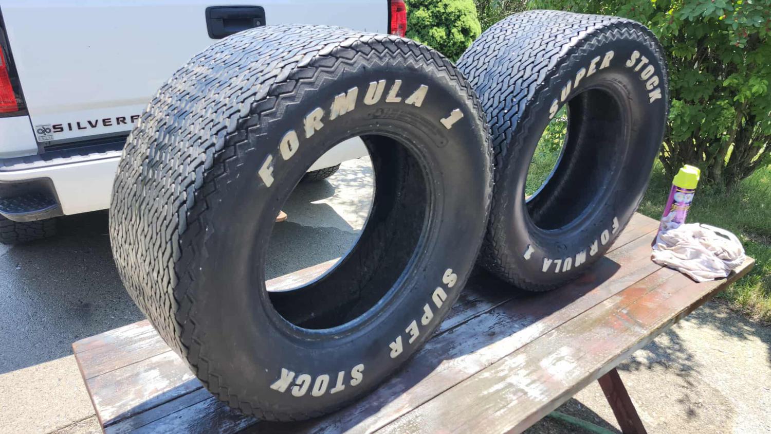 A pair of Formula 1 Super Stock L60-15s. Never driven on, supposedly mounted once. Nibs still on the sidewalls and tread .Still has some of the protective blue coating on the letters and bead that can bee seen in the pictures. One scuff on sidewall that you can barely feel with your finger (im not going to try to clean that up.). Perfect for your Day 2 car for shows or for MCACN. they are nice and pliable with absolutely no dry rot or cracks anywhere. personally I would have no fear of driving on these.