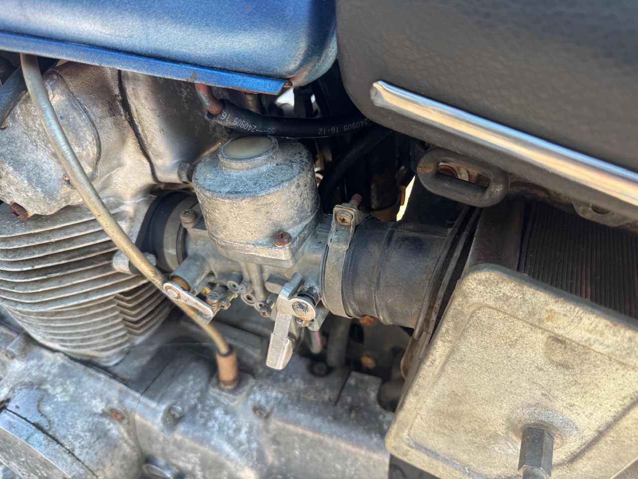 When I bought my 1970 Challenger in 2021 it came with a catch, part of the deal included me buying an old motorcycle from Tommy, who owned the car. I pushed the bike down the street and into one of my sheds and haven’t thought much about it since. I love motorcycles, but never owned one and all of my friends who rode all got hit riding them which killed any interest I had. However the other day I had to move some stuff in that shed and pulled it out. I knew it had compression but hadn’t gone any further with it when I bought it. Looking it over I figured I might as well try to get it running and see what kind of shape it’s in. After doing some research I had purchased a 1974 Honda CB450. About 20k miles on it. According to Tommy it might’ve last ran in the 80’s at some point. He didn’t know. The fuel tank is clean, but one of the carbs was frozen because the throttle didn’t move. So last week I ordered a carb rebuild kit and a few other small parts I saw it needed right off the bat. The handlebars were missing all of the rubber bushings that hold them together. So my helper and I replaced them today and installed the freshly rebuilt carbs. Unfortunately for me someone replaced one of the carbs at some point with a slightly newer CB500 carb. The rebuild kits are 99% the same but the 500 carb has an extra little diaphragm and spring that the 450 kits didn’t have. So hopefully once that comes in I’ll be able to start the bike. I drained the oil, which was double full with very old gas from the bad carbs that leaked down. I also put fresh plugs in it after hosing the cylinders down with pb blaster. I’m sure that won’t foul the plugs out quickly right? Right? So that’s where we stand today. Also picked up a battery that I’ll put on a mini charger tomorrow at work since I don’t think it’ll start without a battery.