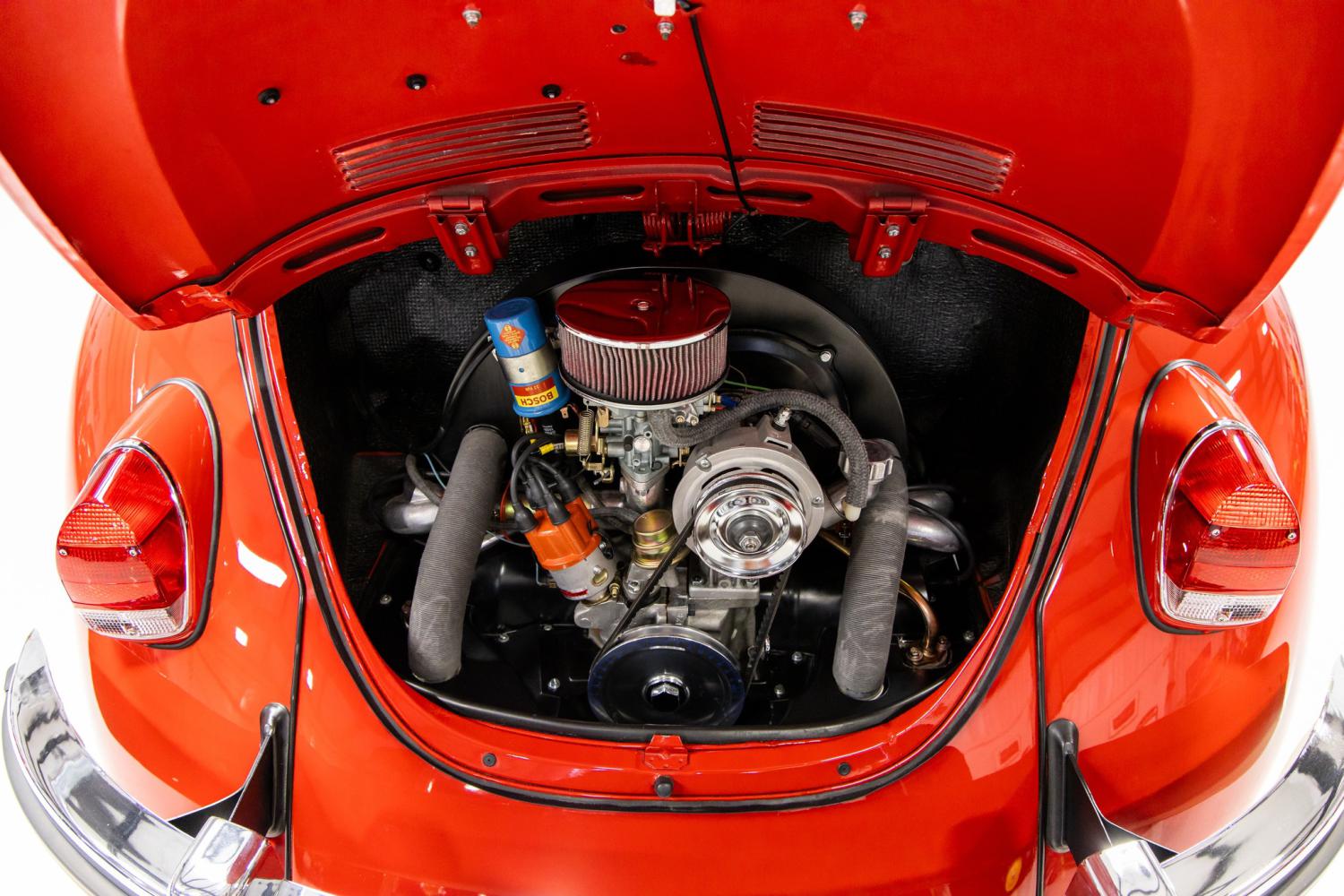 The interior also presents extremely nice and the color matches the exterior theme. The cabin was stripped, prepped, primed and repainted in red. Everything in the interior was restored or replaced new such as the sun visors, rear view mirror, dash knobs, door panels, shifter, pedals and carpeting. The new two-spoke steering wheel wears a chrome horn-ring and fronts a VDO 90-mph speedometer with an inset fuel level gauge. The front bucket seats and rear bench were rebuilt and reupholstered in black with red inserts. Some features include a passenger grab handle, glovebox, three-point front seatbelts, rear seat belts, cabin heater and a RetroSound digital stereo. The spacious front trunk compartment was nicely restored and painted red. The wiring, hoses and fuel tank were replaced new. It's equipped with a new trunk liner and full size spare.