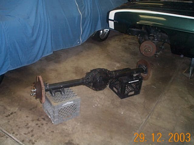 I agree with Jeff H. It looks like a converted '72 rear. The axles look correct- mine has 7206 and WY on the flange. It also looks to have a left and a right side caliper bracket (5977 & 5776). The JL8 used two right brackets (5977).