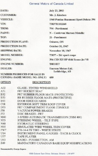 Here's the email he sent to me: [ QUOTE ] Finished in the factory colour of Tuxedo black with a black bucket interior. Powered by the numbers matching 396ci/375hp, L78 engine and a four speed transmission, power brakes, radio delete, dog dish rims with red line tires. A very rare Nova that is rust-free and has documentation (protect-o-plate). The resto is a few years old, but the car is still a nice head-turner, as you can see in the attached photos. This car war purchased at Legendary Motorcar Company. I have added a couple of guages, a tach and a points eliminator kit (still have points). If you haven't heard of Legendary, they do the TV show "Dream Car Garage" (http://www.legendarymotorcar.com/). They only deal in the real thing. The interior is Excellent - The black bucket interior is in very good condition, with no evidence of wear at all. The seats, carpets, panels, and dash have been extremely well taken care of. The seats are in good condition with no rips or tears. There is a small tear in the passenger side sail panel, and the window whiskers need replacing. The exterior speaks for itself in the attached photographs. This car scored an 87 out of 100. It would not take much to make this car perfect. It is a rare car since it is an L78, factory black, with buckets, 4-speed and radio delete. I am asking $60K USD. Let me know if you want any particular photos of the car and I will send them to you. [/ QUOTE ] Bruce