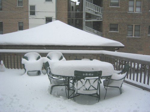 This is out the back window of my building. Look at how high the snow is on the table. Has to at least be a foot. I know there are areas where there is a lot more snow but try driving in this in city traffic during rush hour!