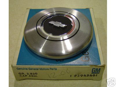 There are several places that make repro horncaps.. Trim Parts makes the best one, but it is not indistinguishable from original, and carries its own part # cast on the back, not a GM #. The most notable difference is the black paint behind the bowtie is usually just flat black on the repros, and originally it was a textured, almost "wrinkle" finish. The red, white and especially blue paints are a little brighter than the original GM shades as well...The rivets holding the inside retainer in are a bit different looking too, but still come loose just about as easy as the originals did. I have seen the repro caps for as cheap as 27.99 on ebay, plus shipping. The GM cap is no longer available, but a few NOS ones are still floating around at swap meets, ebay, etc.