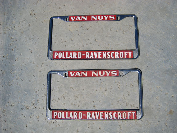 Here's a few Pollard-Ravenscroft pics & old ads below. Is this Dealer Code info the same you have? Good luck w/ the plate frames! [img]<<GRAEMLIN_URL>>/beers.gif[/img] ~ Pete ----------------------------------- Zone # <span style="font-weight: bold">20</span> Dealer Code # <span style="font-weight: bold">403</span> <span style="font-weight: bold">Pollard-Ravenscroft Chevrolet</span> 6001 Van Nuys Blvd. Van Nuys, CA Martin Pollard William Ravenscroft ----------------------------------- ![]() ![]() ![]() ![]() -