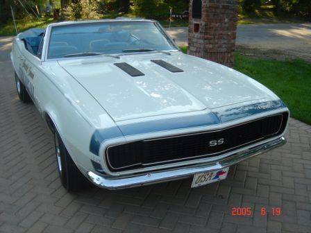 1967 Camaro 1 of 78 Festival Cars (Pace Cars Used for the month of May at the track) Trim tag has these items verifying festival car status 04A Builddate-cars used at track have 03C or 04A Builddates 0-1 Paintcode –special paint clear put over blemish free white paint 5Y – the denotes stripe delete or special colorstrip Pace cars have blue strips while other white cars have black stripes Other pace cars musts that car has RS-SS (3L 4P) Power front disc 12 bolt non posirear with right side traction bar manual top Car has been restored using GM parts where ever possible including rear ¼ mostly original interior with about 65,000 Not original motor but restored to look original with correct intake, value covers, aircleaner, ect.