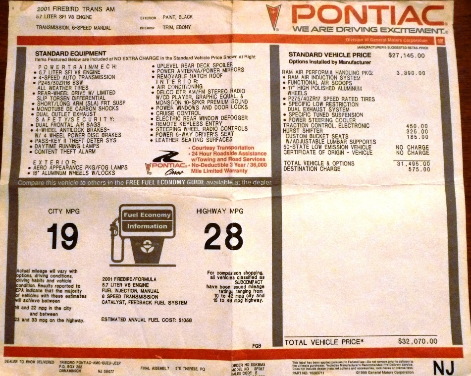 It is a real WS6 car with the confirmation letter from ASC indicating it is one of 1,583 Black, WS6’s with T-Tops and a 6 speed, made in 2001. The WS6 was an upgrade from the Trans Am (similar to the Camaro SS). The cars were shipped from the assembly line to ASC where they were upgraded and then shipped to the receiving dealers. The WS6 package included the Ram Air hood, matching air cleaner, upgraded suspension, power steering cooler, 17” wheels with 275/40R17 tires and free flowing dual exhaust. Other options on this car are the factory installed Hurst shifter, traction control, and custom leather buckets. The original sticker price was $32,070 in 2001. The only thing that differs from stock is a Magna Flow muffler that the original owner added. In perusing the 16 years of service records, the items replaced have been a door speaker, the alternator, various idler pulleys, one catalytic converter, the steering rack, power steering pump and hoses, and the rear differential was rebuilt and the bearings were replaced. All of this was done by GM dealers under warranty with only GM parts. Things I have done to the car since I bought it in 2014: I changed the original plugs and wires (All original parts have been saved and go with the car). The plugs were burning perfectly as you can see in the photo. I replaced the carpet, which was heavily stained with years of spilled coffee marks. I also replaced the driver’s door panel (which had the typical crack at the top) with a perfect door panel. I also had the outer sail panel removed and replaced with a sail panel from a prior year Trans Am. (GM had a major issue with a faulty adhesive used on the assembly line to attach the sail panels on the Camaros and Firebirds from 1999 onward: after several years, the adhesive would eat through the plastic body panel and cause blisters in the plastic and paint. A technical service bulletin detailed the extensive process and parts needed to replace the panel properly. Had the original owner known of this “secret recall” she would have definitely had it done by the dealer – but they never volunteered the information while she had the car. The car runs, drives, and handles beautifully. Everything works including the power antenna. Very tight and crisp performance from the 63,000 mile, Ram Air, 325 horsepower LS1 and 3.42 rear end ratio. The original clutch works perfectly with no noises from the throw-out bearing. The original owner was an over-the-road truck driver and knew how to drive a stick! She was a very cool lady, indeed. The 6-speed WS6 cars are extremely hard to find – the majority you see for sale are automatics. It is even harder to find one that had not been modified and beaten to death. This car is a very nice, unmolested example and you will not be disappointed. $16,000. ***** (reduced to $15,000 as of 10/8/17) The car is here in central New Jersey. Full VIN available on request including block VIN photo which was a doozy to get - I had to use a mirror and photograph it in reverse - it is nearly impossible to get access to! Thanks, Steve PM me here and I will respond back ASAP. Last edited by njsteve; 10-08-2017 at 03:24 PM. |