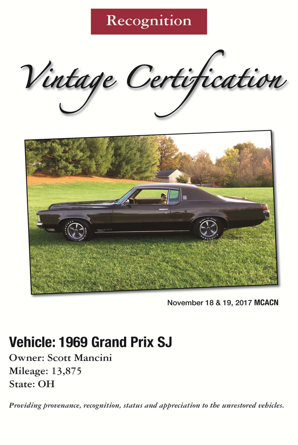 Vintage Time Capsule - Vehicles that are 95+% unrestored in all reference areas Vintage Legend - Vehicles that are 85+% unrestored in all reference areas. Vintage Heritage - Vehicles that are 85+% unrestored in four reference areas. Vintage Legacy - Vehicles that are 85+% unrestored in Four reference areas Vintage Reference - Vehicles that are 85+% unrestored in at least two /three reference areas. Reference Areas: Certification consists of two areas of consideration, Originality and Preservation. The six Reference areas are as follows: • Operation • Engine Compartment Area • Exterior Body • Interior Body • Underbody • Trunk (where applicable) Participant vehicles receiving awards after completing our 3hr thorough certification/inspection process are: Robert Schumacher 1968 Chevelle- Time Capsule Charles Lillard 1970 LS6 Chevelle - Legend John Keane 1961 Corvette - Legend Larry Sachs 1966 Corvette- Legend Dave Beem 1968 Camaro Z28- Legend Mark Bulaw 1969 RS/SS Camaro- Heritage Jim McGreal 1968 RS/SS Camaro- Legacy Dave Belk 1971 Cutlass Convertible - Legend Bail Beck III 1971442 W30 Convertible- Reference Scott Mancini 1969 Grand Prix SJ - Legend Frank Karabetsos 1967 Belvedeere- Reference Harry Snow 1970 Buick GS Stage 1- Legend I want to thank all our Vintage Certification program participants. It was a truly amazing collection of cars. Our Judges in alphabetical order: