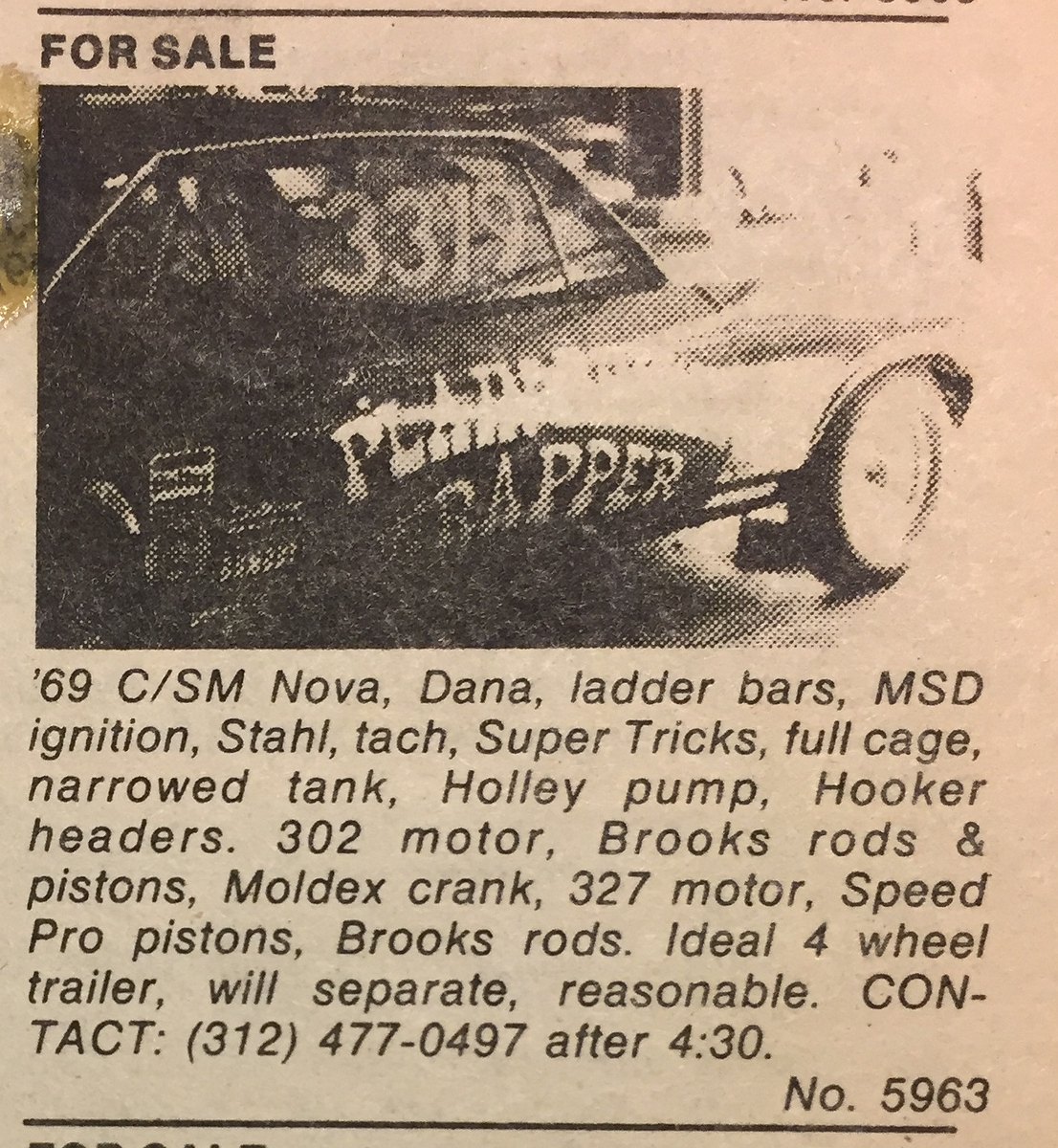 After I purchased the Nova my first goal was to track down some of the history-because at this point nobody else could find any. Starting with a decal I found in the glove box from an old Gulf gas station it had the name Gail Simons on it. That name was also on the car. There was an address in Taylor, Michigan on it, so I started with that town. The gas station was long gone. I started searching other names on the car in that town. I found a Dale Cado that graduated from Jefferson high school in 1970 in Taylor, Michigan. I kept looking for that person and found him living in Chicago. I found his work address and phone number and with my fingers crossed made the call! Dale answered the phone on the second ring. I told him I had a strange question to ask him. I was looking for the original owner of an old Nova drag car. Before I could finish my sentence, he shouted out the Plain Brown Wrapper? YES!! That was me gave me chills! He was just excited as I was. Dale was able to provide me with all the history on the car along with a bunch of vintage pictures of it. The car was ordered originally from Les Stanford Chevrolet in Dearborn, Michigan in 1969. It was Fathom Green with a black vinyl top. It was a Super Sport with a bench seat and a 4 speed car. Dale street raced the car for two years-but as the car became less steetable, it became a dedicated track car and was given a silver psychedelic 70's paint job. The car first raced in modified production with a tunnel rammed small block at tracks all over Detroit (like Milan, US131 and Detroit Drag Way. The car later switched to C super modified and Dale couldn’t handle the psychedelic paint job anymore, so in 1975 the car was painted the current brown and first became the Plain Brown Wrapper. During the off-season Dale would show the car at the Detroit Autorama. Dale worked at Diamond Racing Engines and after blowing up the engine in 1980 with the cost of competition getting so high, he finally decided to hang it up-but to do so he quit his job and relocated to Chicago to make a clean break from racing. The car was sold through National Dragster magazine and Dale provided me the original for sale ad as well. The car has changed hands five times since he sold it, but the history was lost after the second owner. The car as it is today is exactly how it was in 1980 when Dale sold it...every decal the same, even the tires! (Minus the race engine). I hope you enjoy the feature, Russell