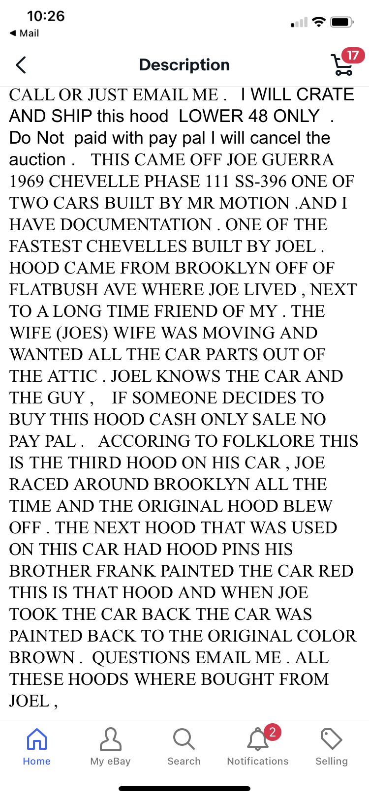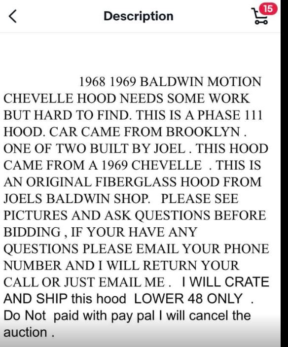 Now on eBay for the second or third time, seller claims this hood was on Joe Gs burnished brown 69 Chevelle while it was painted red and owned by his brother. (FOLKLORE)