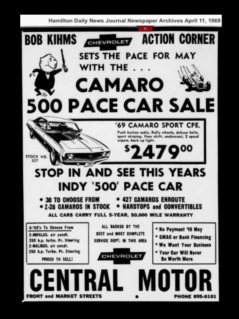 Couple more '69 ads from Bob Kihm's Central Motors Hamilton Ohio w/ 427 Camaros noted. Lots of Pacers 04/11/69 also Z-28's but 427 Camaros on order then in stock 08/07/69. ![]() ![]() ~ Pete .