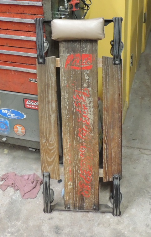 I accidentally lowered a car onto one corner and broke one of the original cast iron wheels. I found out that Lisle doesn't make these wheels any longer, but found one on Ebay. Figured for five bucks, even if all I got was some spare wheel assemblies, I was way ahead of the game. The "Lynn's Auto Parts" creeper is going on the wall.