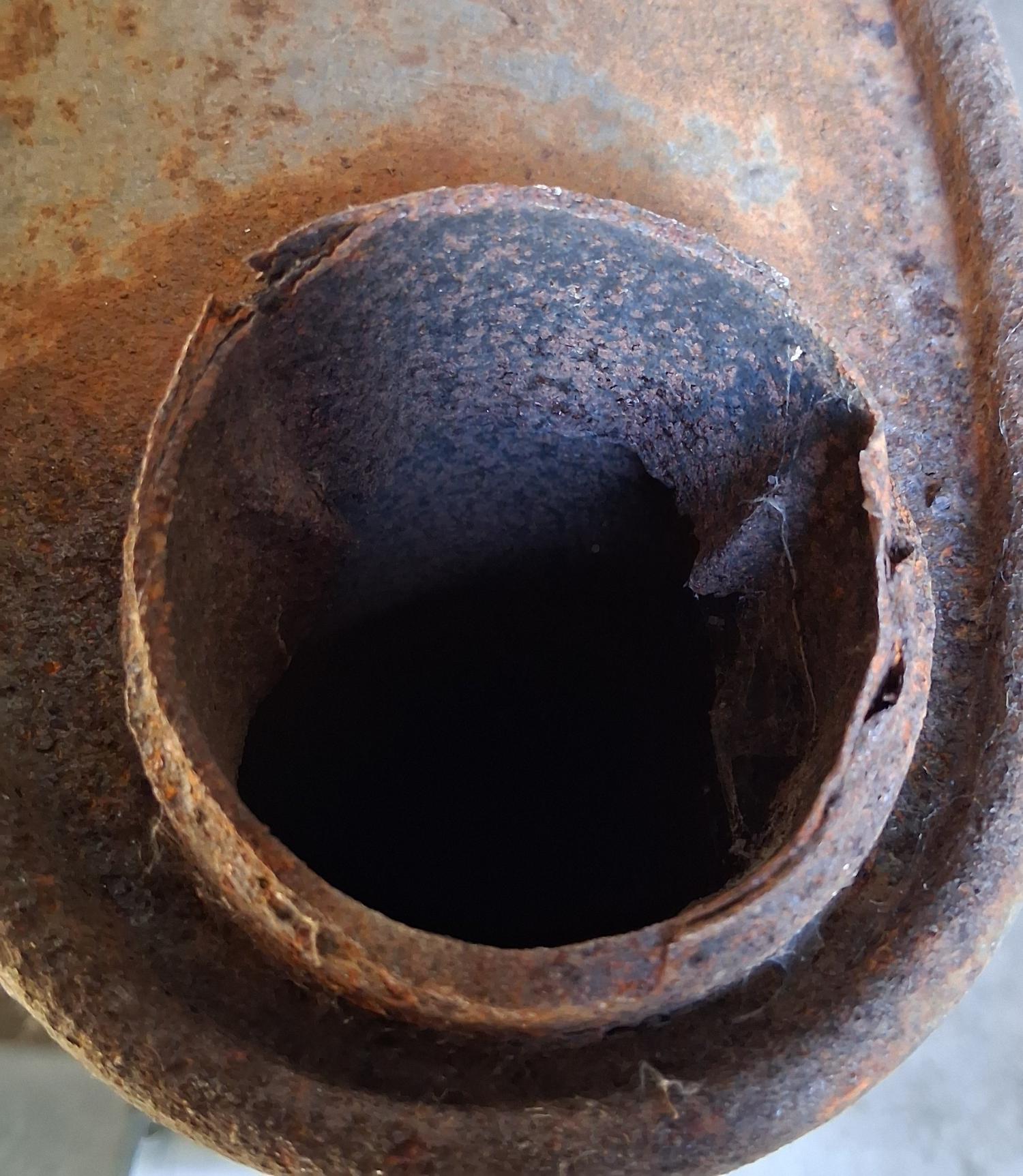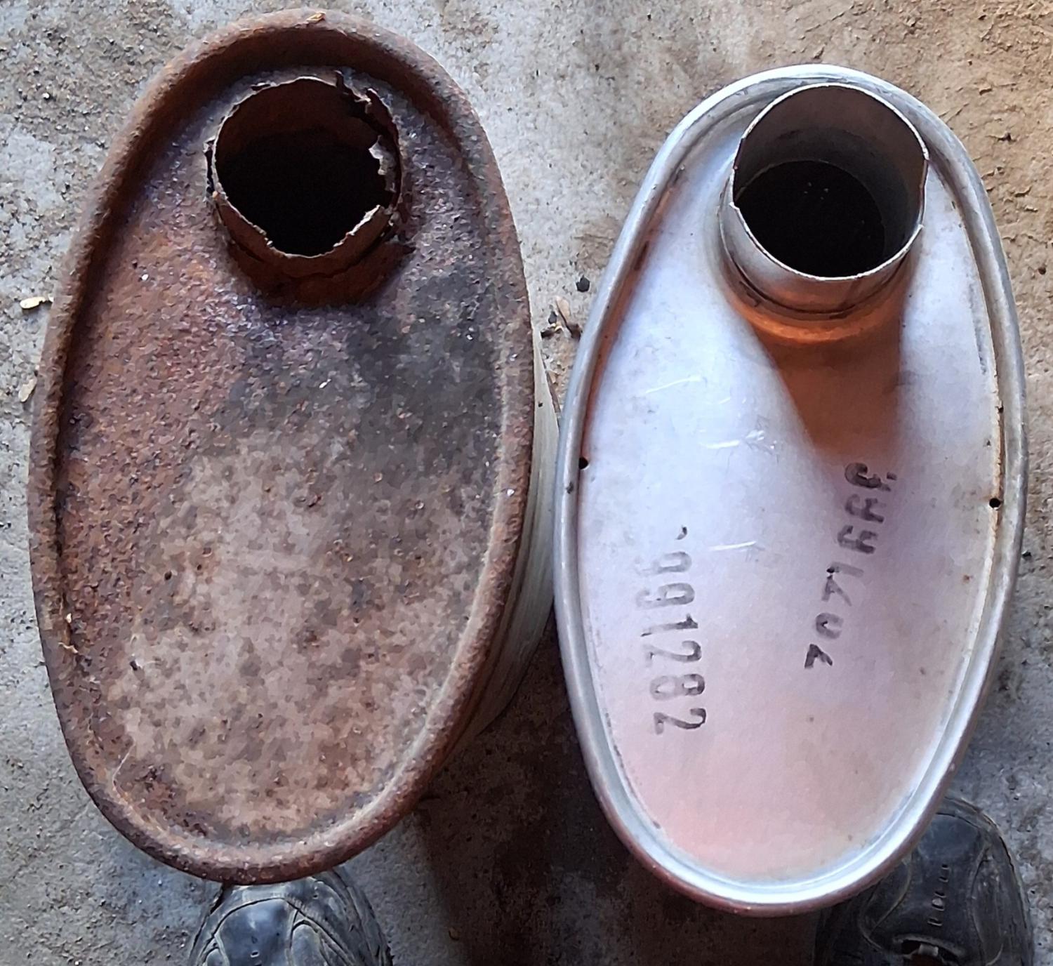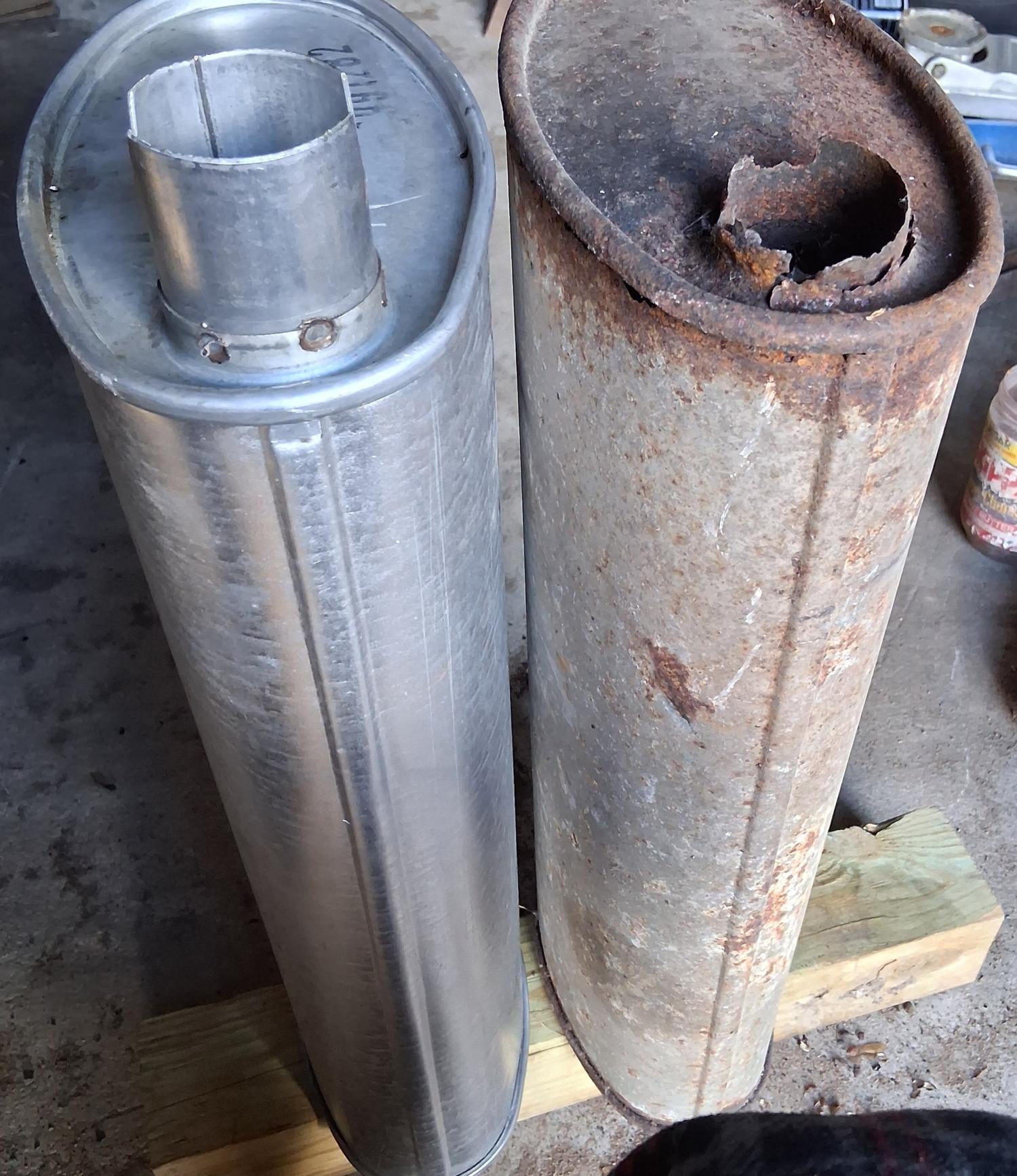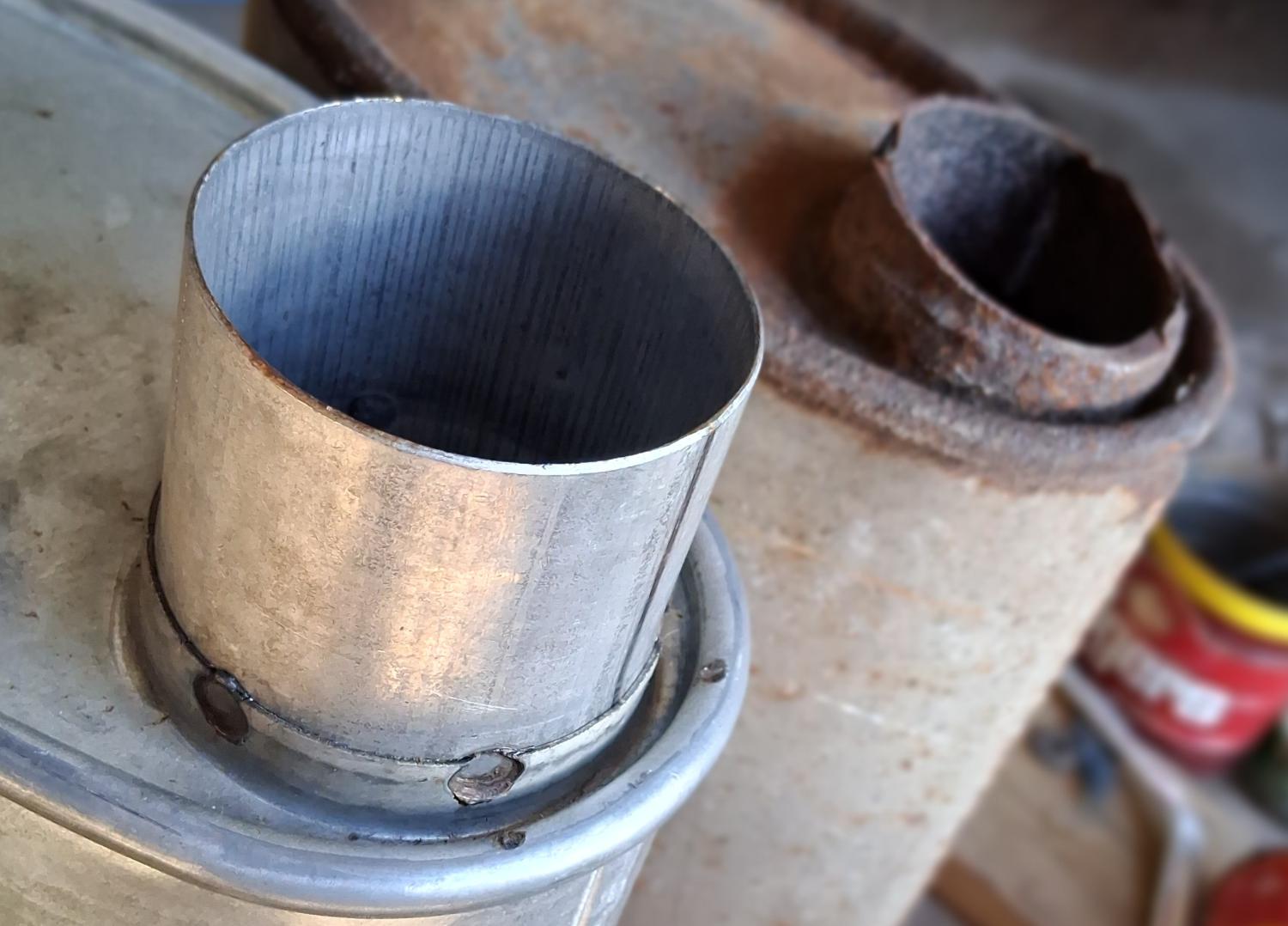 Pic 6 and 7 show same construction with the service part having a nipple spot welded in where the head pipe would be welded in on a factory setup. Same muffler other than that.