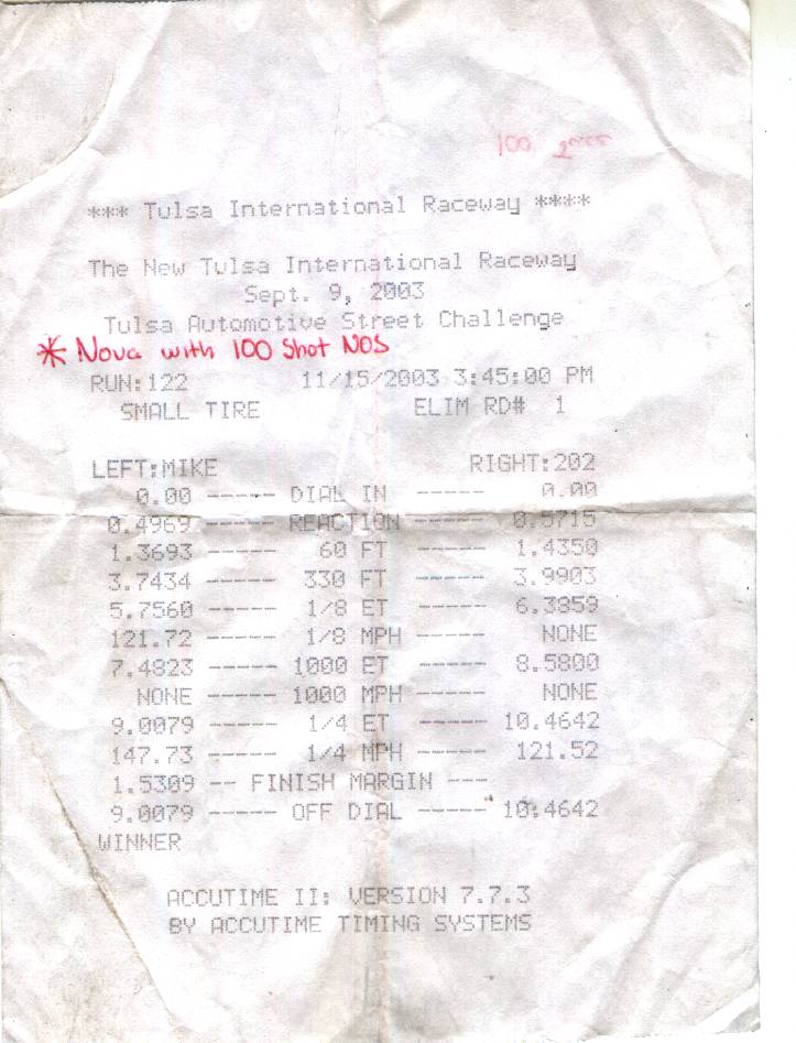 9.50 on gas, they have run a 9.15 on the juice but when the punch off the line with the bottle this is what happens. They don't want to go with wheelie bars because they compete in the shoot outs. Not sure about the MPH, but I'll find out Monday. Better yet, I'll make them give me a copy of a time slip and scan it.