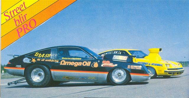 The black Omega Oil sponsored Monza was ordered by Mr Gasket Company from Don Ness Race Craft in 1978 as one of two identical cars. It was to be driven by Rickey Smith but was only used as a back-up car to its twin. It was later bought by Joe Anderson who used it as a pro-stocker and as a "gasser". After that the swedish guys Westerfors and Rodeblad brought the car to Sweden. The yellow "Skip"-Monza is a former Bill Jenkins car built by SRD in 1977. It has the special Jenkins 3-link rear suspension, it says in the article. Jenkins promized Sven Andersson 8-second runs with the car, and so it did ! Sven got a Jenkins-built 381 cui engine (400 block/350 crank) with the car, that among other things had a special General Kinetics cam in it.