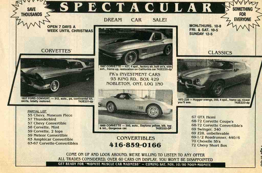 he still sells cars but from his house off hwy #27. he did have a Mosport green big block vette there last summer and maybe the summer before that ! ![]() we stop just to pass time on our way home from Brampton now and then. |