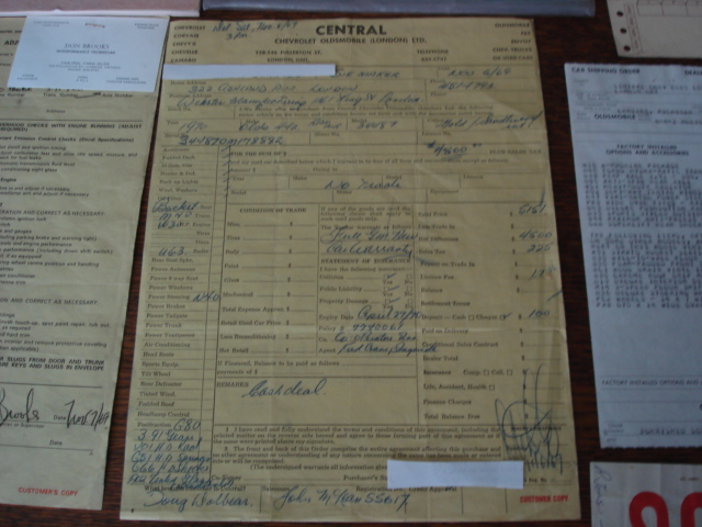I own a 70 W-30 purchased new at Central Chev in London Ontario. I have major paperwork with the car, from cncelled cheque to key knock outs in an envelope, all order forms, window sticker, pre delivery, etc. I an looking for anything dealer related, ie license frames to use on car. any leads would be greatly appreciated. I only assume the dealership was heavy into performance in the day. Anyone owning a car sold there, I will send picures of their original paperwork forreference. Thanks. Gene