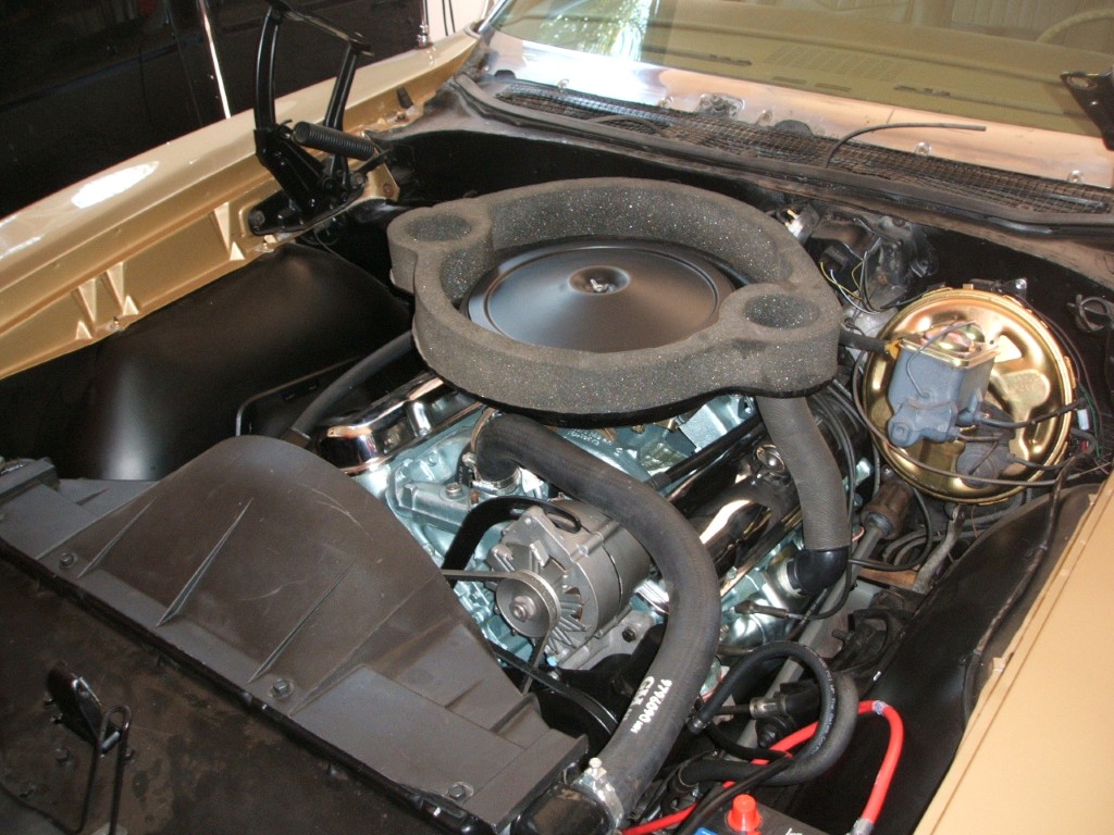 When I bought the car it came with a 69 WS block.I did some checking and found out it is a restamp block.69 RA III blocks are nothing special.Just another 2 bolt block but has a diff code depending if a auto or 4 speed.Anyway,I built it from the block up to look like a RA III engine.The crank is a Ohio crank forged 4.21 stroke unit.Forged H beam rods and Ross 4.155 bore forged dished pistons for 9.5 CR.The heads are correct 69 RA III #48 heads.The cam is a compcams hyd roller with comp lifters.The heads were done by Joe Sherman racing.All new valves springs,retainers etc.H&S full roller rockers.I had nothing to build the engine so had to buy every nut and bolt to build it.It will be a very nice 455 stock looking 400 RA III driver.