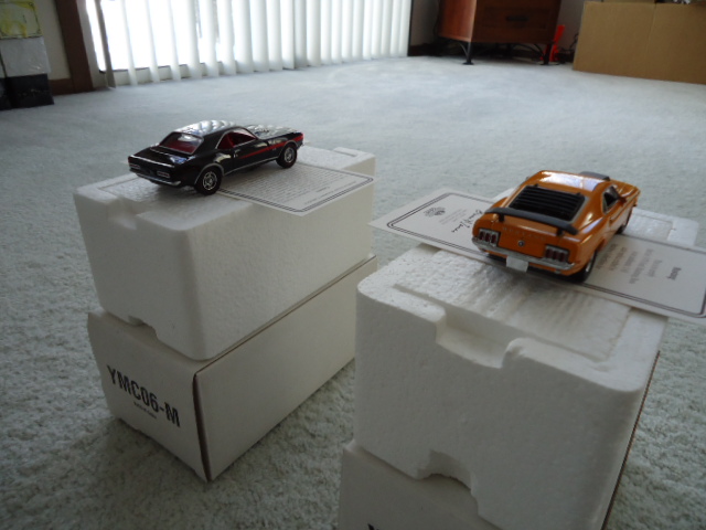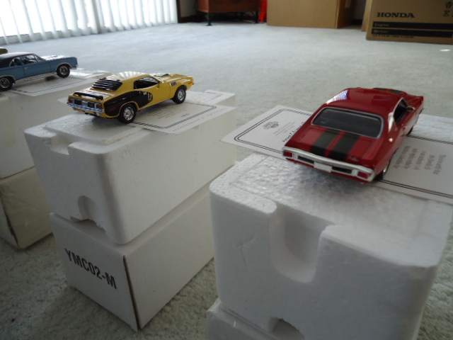 Just opened up their boxes this week to take photos after being in storage for 18 years. Each car comes wrapped in tissue in it's own Styrofoam cocoon,in it's own shrink wrapped shipping box. Each box is numbered outside to match the car inside. Each w/Certificate of Authenticity in incredible detail and vibrant bold colors.No sun fade from displaying. All rubber tires very pliable,no cracking. Detailed undercarriages on all. $250 for all 6 plus ship. 1970 Chevelle SS 454 Red 1971 Cuda 440 6pk Yellow 1967 Pontiac GTO Blue 1970 Road Runner Hemi Green 1970 Boss 429 Mustang Orange 1968 Camaro SS/RS 396 Black Rick REDL78@ATT.NET |