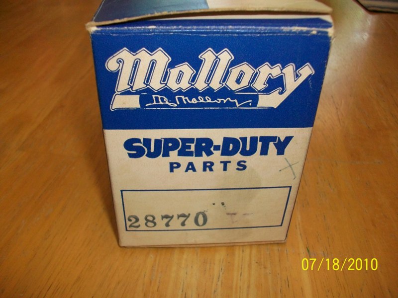 I have a Mallory Rev Limiter. Part number 28770. It comes with a copy of the instructions dated 6-70. I see a small mark/circle around one mounting hole but nothing on the other hole or the actual dial mounting holes. It is in perfect condition. I personally think it is NOS.
