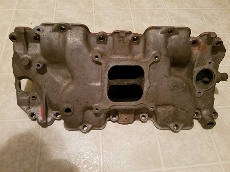 Early take off Low Rise Aluminum Square Port, 3963569 454 Big Block and 396 375hp. This intake is in MINT Shape and does't even have carbon build-up. It still retains the original factory orange over spray. Sold