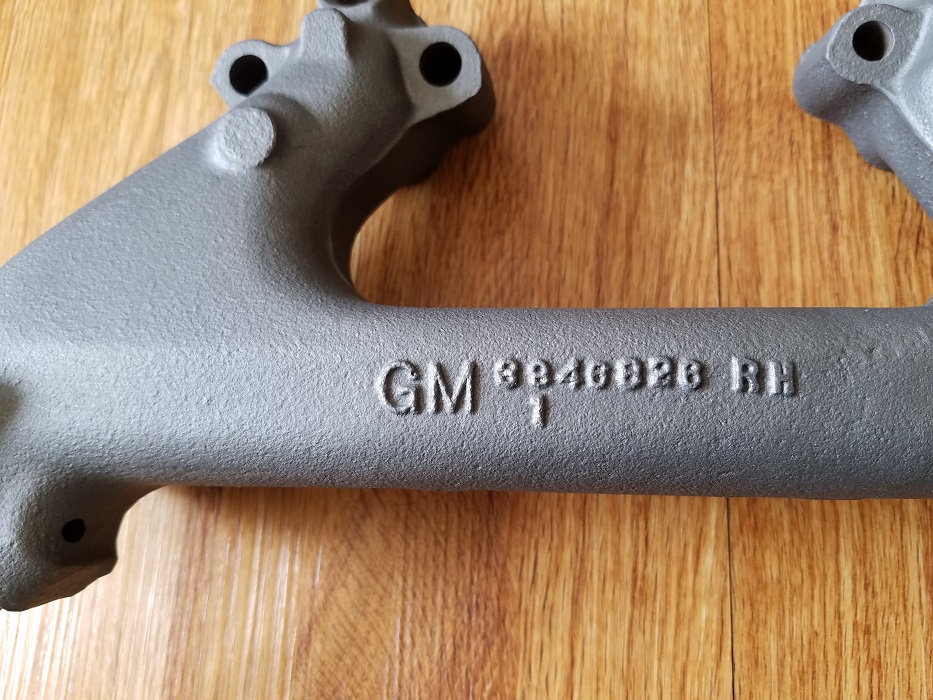 I have very nice pair (527 / 826 Exhaust Manifolds) used on factory 4spd cars, like the Z28 and SS Camaro. Manifolds dated in this time frame are tough to find. The 527 is dated B 17 9 and the 827 is dated A 30 9. These manifolds are bolt on ready and have a coat of cast iron gray made by Xtreme Temperature Coating.