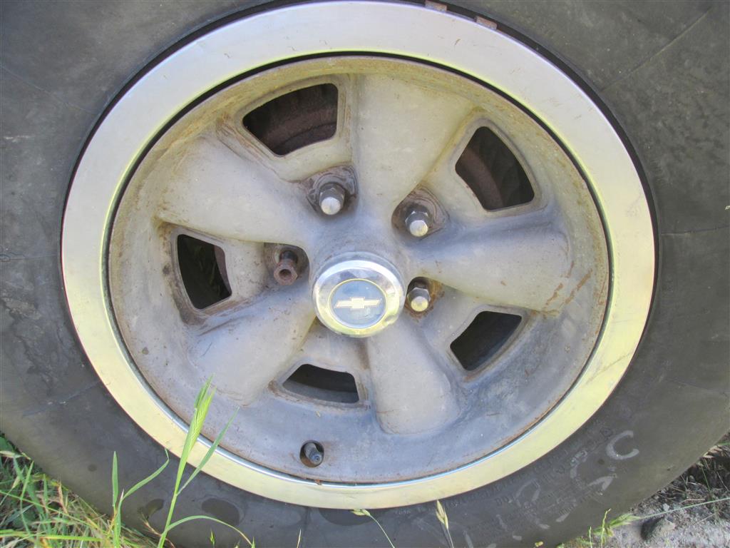 The are a total of 5 wheels. All are original to the car and are the original 1971 SS wheel. The 4 wheels on the car are complete less one center cap. The spare is a bare wheel with the original spare tire(very aged).