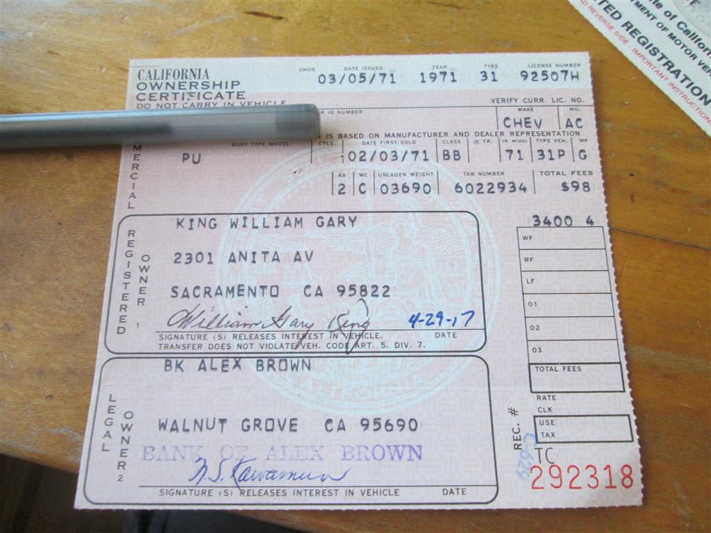 As mentioned above, this El Camino still has its orginal California title which was issued in March, 1971. It also has the original California black and gold license plate. The car was taken off the road in 1976 after a minor fender bender on the left front which is the reason for the replacement fender. The 58,5xx on the odometer is the original mileage of this Elky. I have not searched for a build sheet in this car. I am confident there are multiple buildsheets to be found. While this is a project, it is definitely the right car to start with!