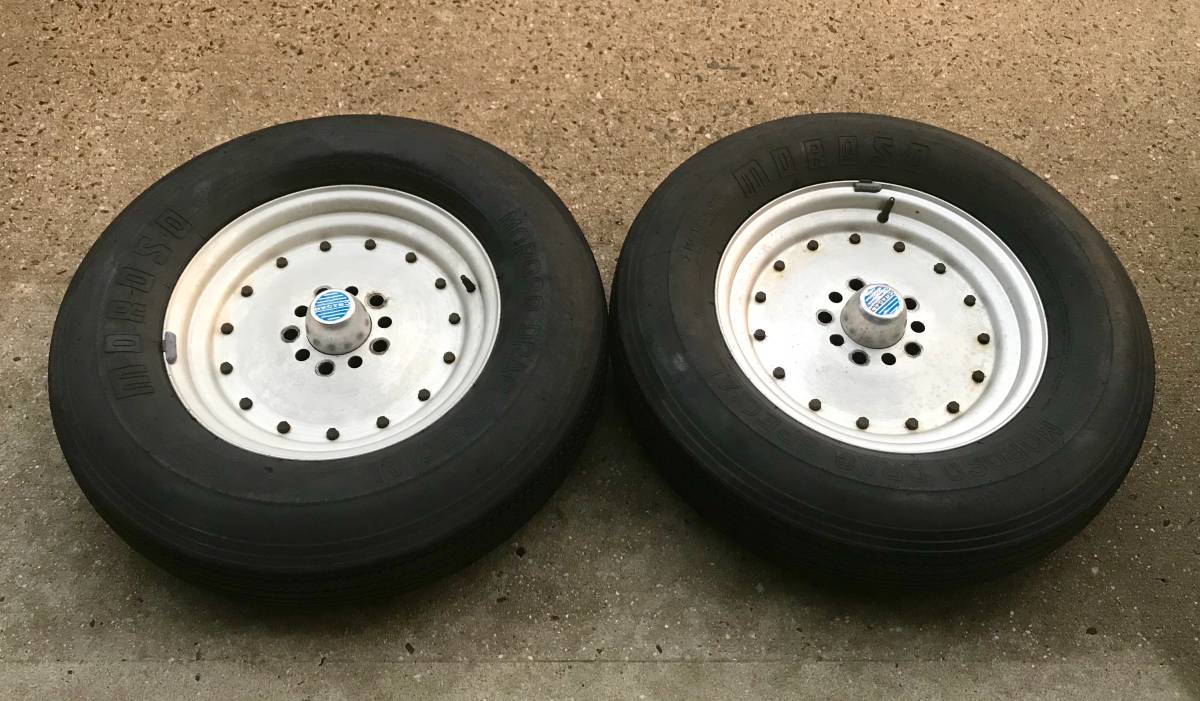 I also have a pair of satin cragar super trick wheels, 15x3.5" with 5x4.5" (ford, dodge) & 5x4.75" (gm) dual bolt pattern. They have moroso drag special tires on them which are old but do hold air. (SOLD)
