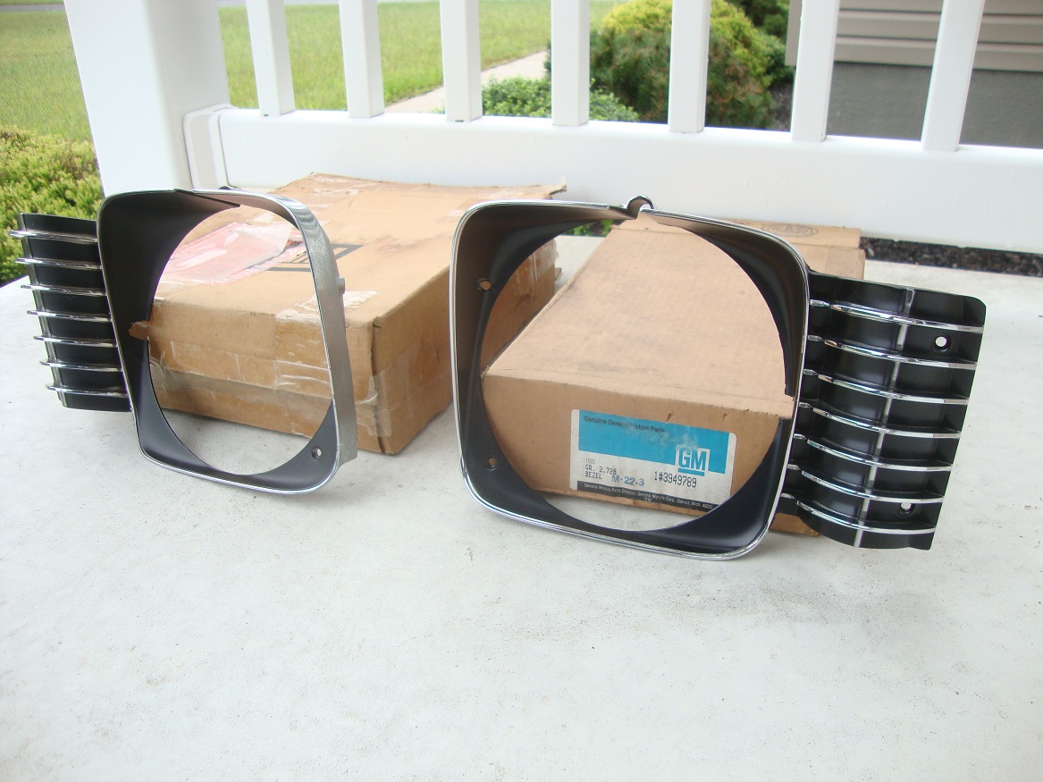 Matched pair of NOS GM 69-72 Nova headlight bezels. Part numbers are 3949789 and 3949790. Great shape. They just need cleaning and polishing from years of storage. One box is missing the GM sticker but it is a GM box. $250 pair shipped.