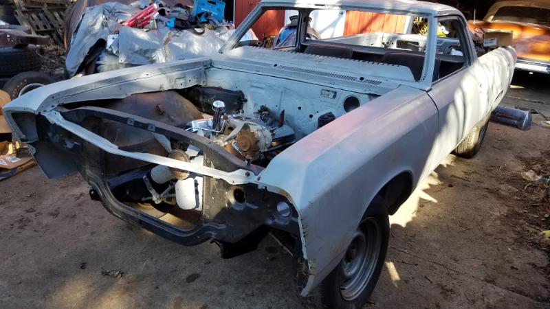 Still disassembled as I got it. Thinking about making it a roller. This EL Camino is in decent shape needing the hood replaced and the roof skin, everything else can be repaired for it's in decent shape for being 51 years old. The EL Camino since taken apart over 30 years ago and three different storage facilities some original parts are missing, but the most important parts, the "Born With" drive train are present.