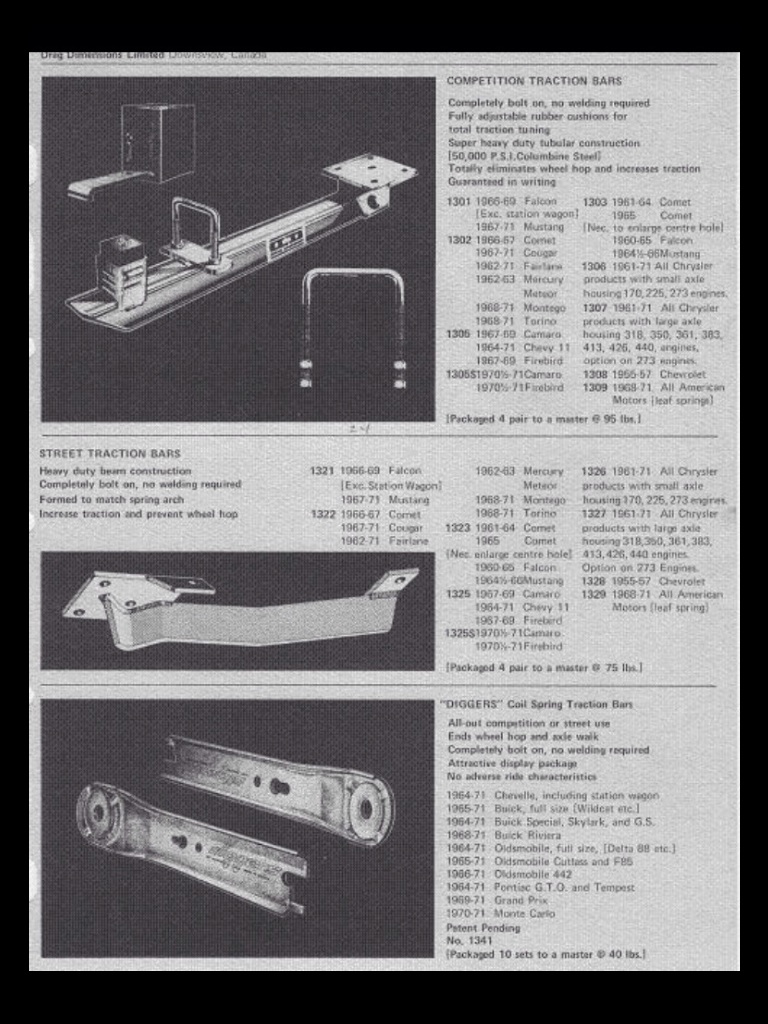 Completely different style/principle but if any interest, Canada's Drag Dimensions offered Coil Spring Traction aids called 'Diggers' for 64+ A-Body cars as bottom of this '71 DD Catalogue pic below. Diggers were designed by one of Drag Dimensions' owners Carl Rowland who was better known for his NHRA C/Altered Record setting Fiat, usually sporting Karbelt livery. RIP Curly. ![]() ~ Pete .