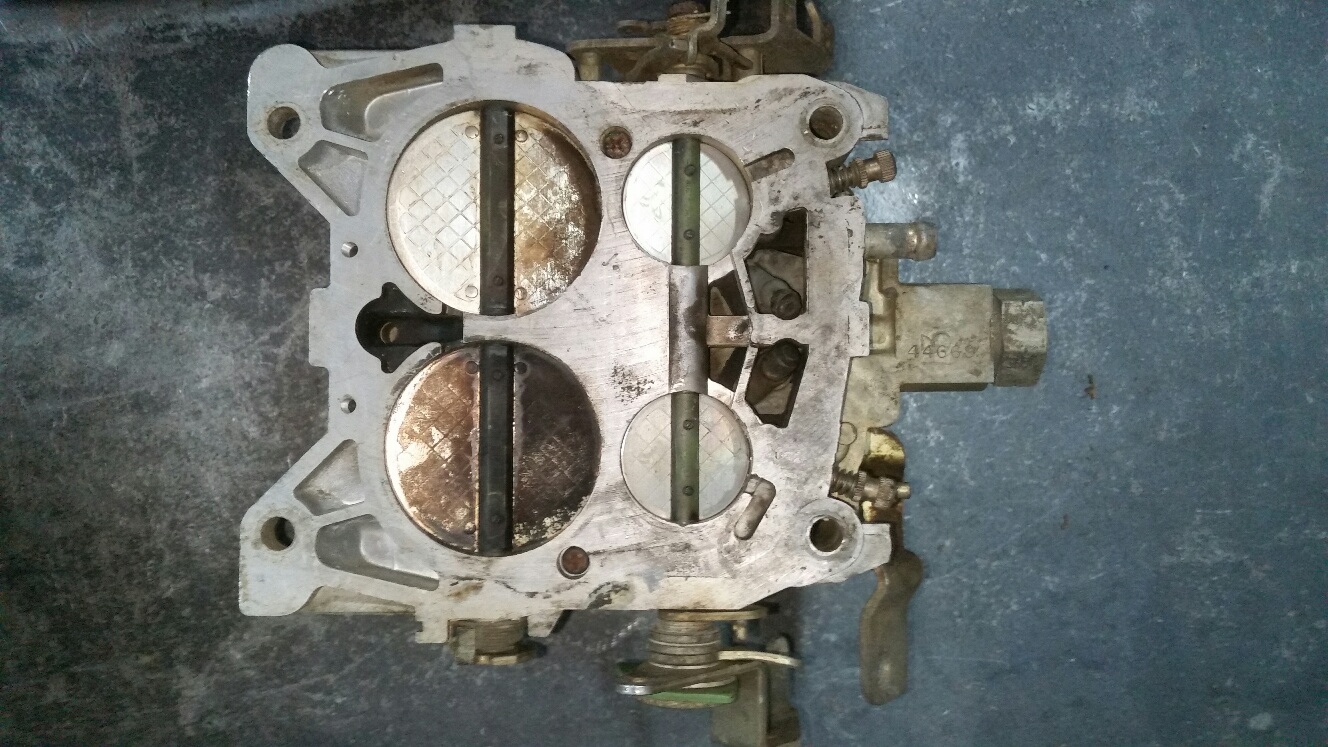 SOLD...This is a pretty nice carb and still has the tag on it. It's dirty, but has pretty good color to it. I can see that there are 2 pieces missing, the rod that connects the primary and secondary shaft and the vacuum pot that goes to the secondary door. There may be more missing that I don't know about. Everything moves free and smooth and seems to be in real good condition. I have not removed the top to look inside. I don't know of the fuel inlet is original or not. $500 plus shipping. 7040286 D00F E