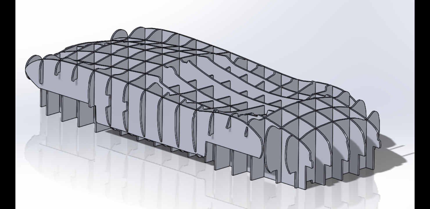 More progress progressing forward! Latest feedback from the CAD people is this rendering which shows the skeletal sections under the sheetmetal body to verify fitment. What you see it's what I'll be getting out of wood, both horizontal and longitudinal. All parts will interlock and they'll be a keel down the center foot rigidity as well as alignment proposes.