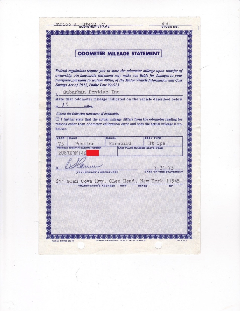 Enrico was one helluva guy. Here's another tidbit from the document files. I remembering him telling me how he bodily threatened everyone at the dealership not to test drive his car when it got delivered. Of course what happened immediately after it was delivered off the truck? When Enrico saw the hand-edited mileage on the odometer statement that was changed from "5" to "15" miles he had a quite the animated discussion with any and all employees within earshot of the dealership. |